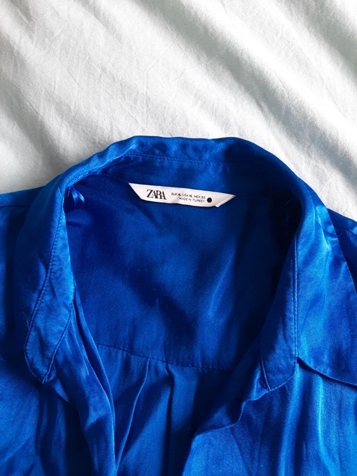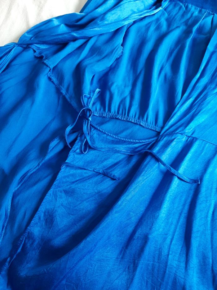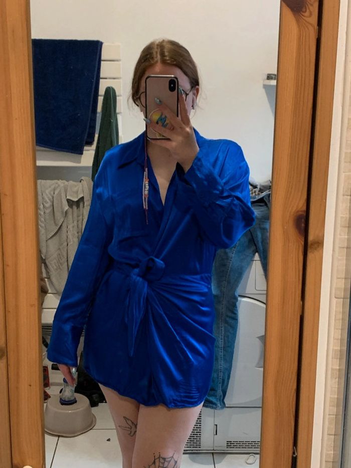 Je vends cette robe/tunique bleu métallisé idéal en tenue de fêtes Satiné brillant En portefeuille. Taille XL moi en taille XL je l'ai porté avec une jupe dessous. Ma fille en photo fait du 38 (cela montre ce que ça donne malgré la taille XL du vêtement. Désolée, pour les photos la robe je l'ai simplement passé rapidement au defroisseur vapeur