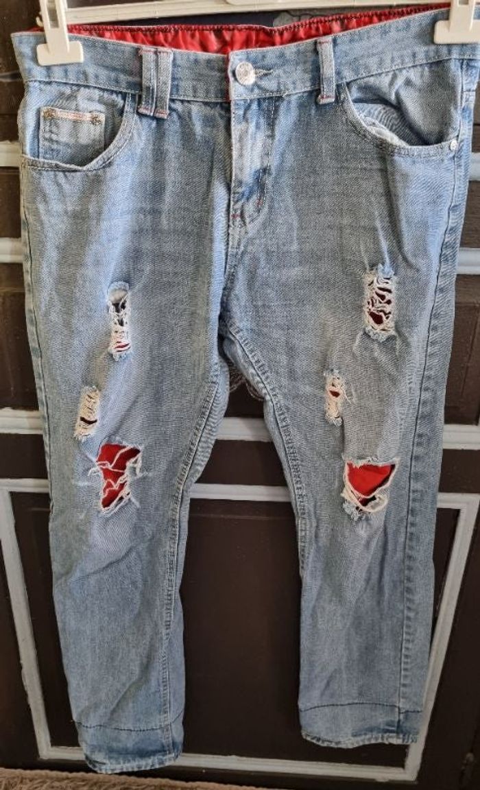 Jeans à trous taille 44 mixte, longueur 96cm, largeur de la taille 44cm, largeur cuisse 26cm, largeur cheville 15cm.
