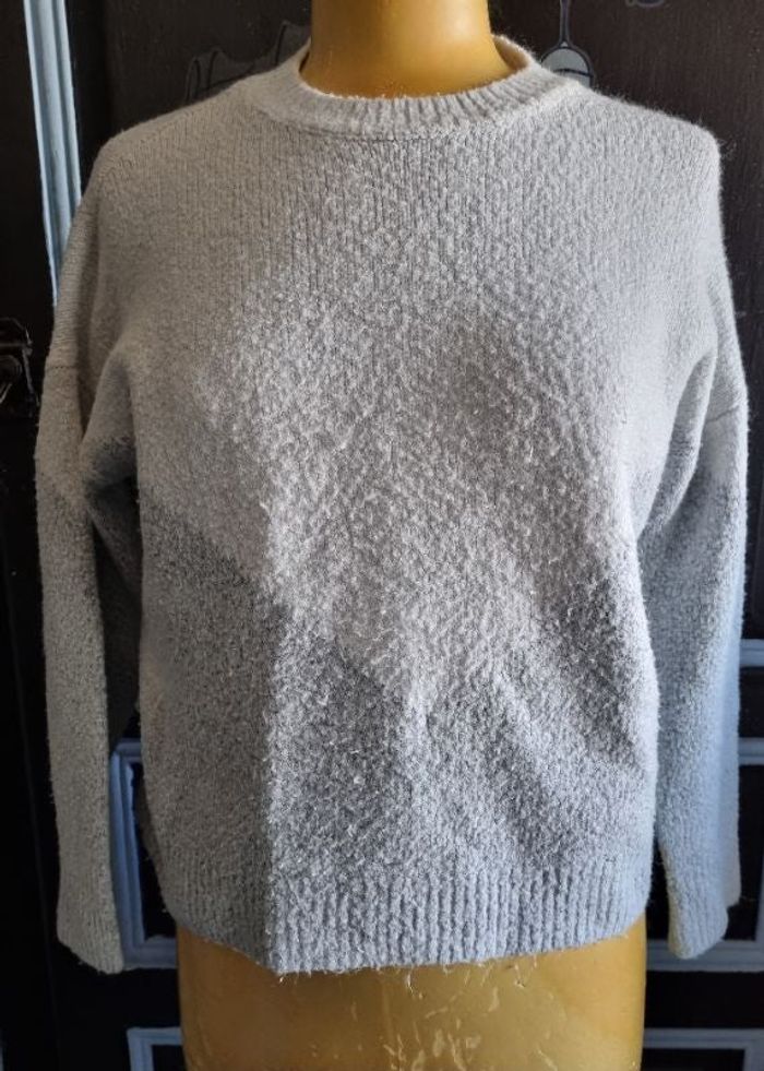 Sweat court bicolore effet bouloches, taille L marque Pull Lover Jennyfer, longueur 51cm, largeur 55cm,longueur épaule à aisselle 15cm, largeur aisselle à aisselle 57cm, longueur manche 42cm.