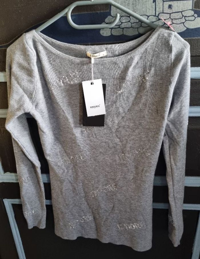 Pull gris avec écriture en strass, taille Unique convient pour du 34-36 marque Enzoria,longueur 62cm, largeur 34cm, longueur épaule à aisselle 17cm, largeur aisselle à aisselle 39cm, longueur manche 49cm.