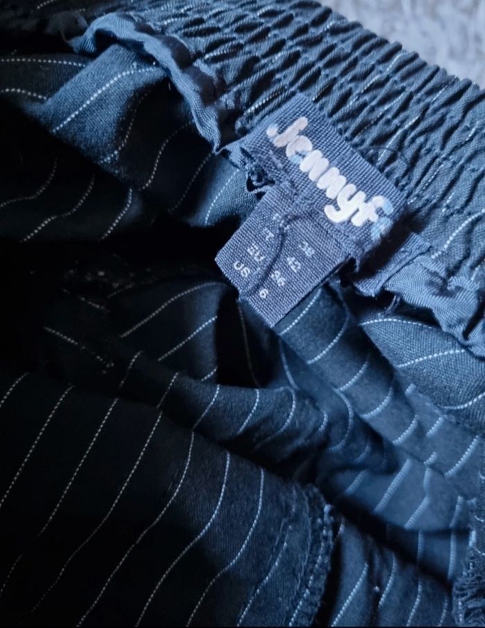 Pantalon noir rayé, taille 38 marque Jennyfer, longueur 86cm, largeur de la taille 35cm jusqu'à 38cm, largeur cuisse 23cm, largeur cheville 15cm.
