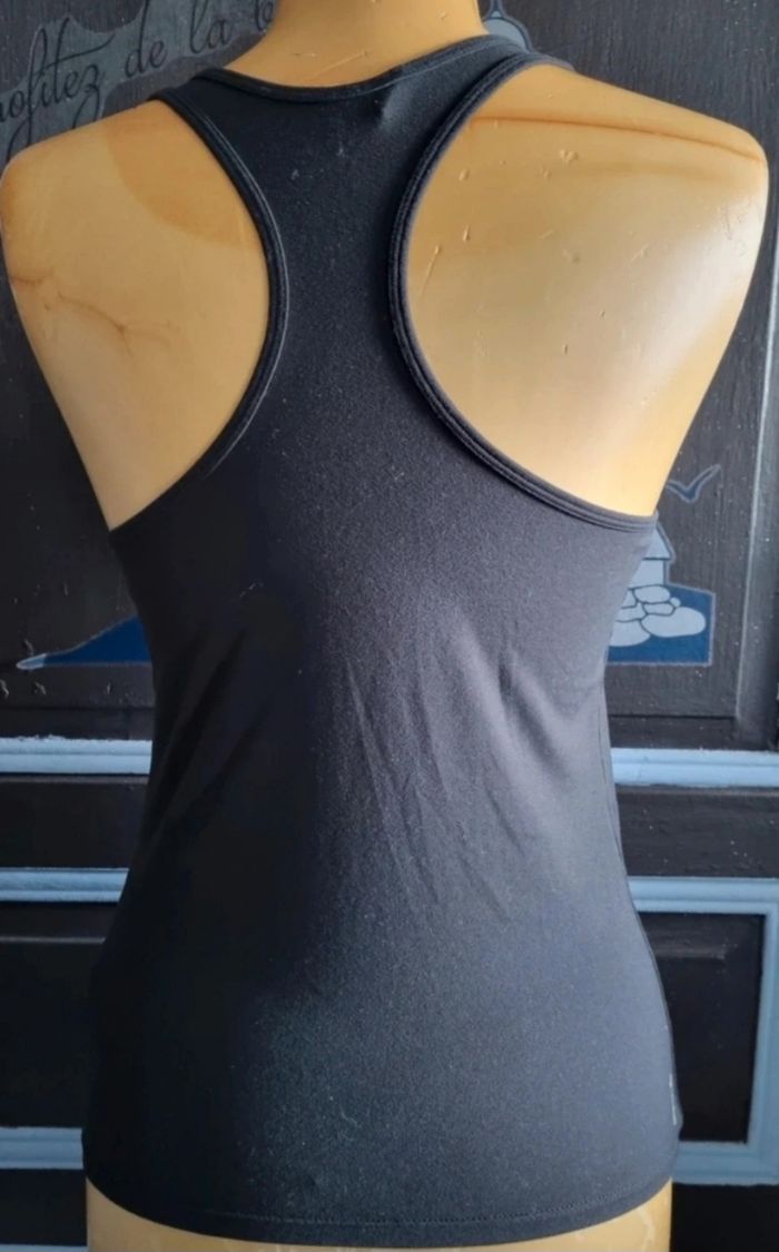 Débardeur noir taille XS marque Domyos, longueur 58cm, largeur 34cm, longueur épaule à aisselle 20cm, largeur aisselle à aisselle 36cm.