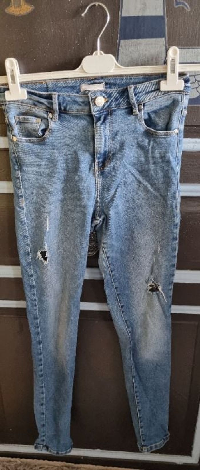Jeans à trous taille 38 marque Cache-cache, longueur 94cm, largeur de la taille 36cm, largeur cuisse 19cm, largeur cheville 12cm.