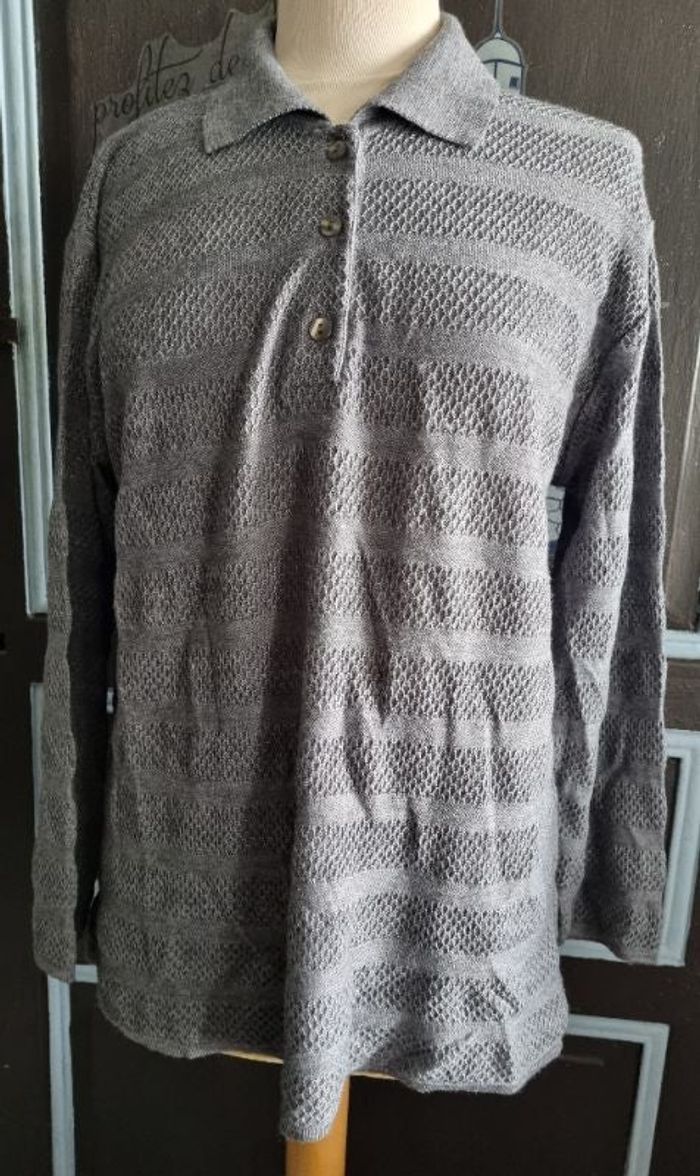 Pull gris taille 44 marque Eléane,longueur 66cm,largeur 56cm, longueur épaule à aisselle 24cm, largeur aisselle à aisselle 56cm, largeur épaule à épaule 45cm, longueur manche 42cm.