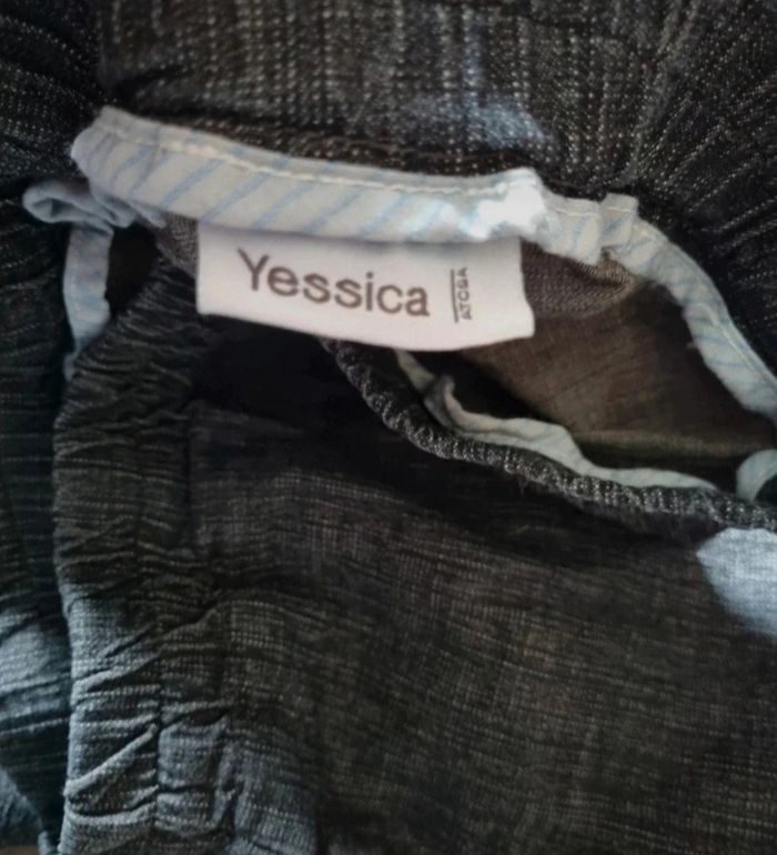 Pantalon gris élastique à la taille, marque Yessica taille 46-48,longueur 99cm, largeur de la taille 46cm jusqu'à 50cm, largeur cuisse 28cm, largeur cheville 19cm.