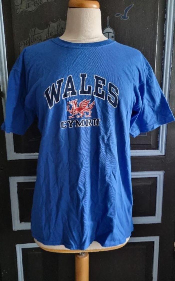 T-shirt bleu avec écriture, taille XL marque Gildan, longueur 67cm, largeur 48cm, longueur épaule à aisselle 23cm, largeur aisselle à aisselle 48cm.