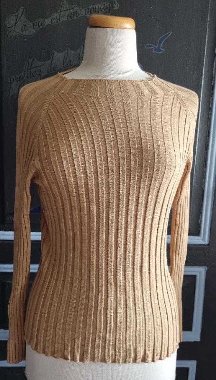 Pull beige taille S marque Amisu,longueur 53cm, largeur 35cm, longueur épaule à aisselle 19cm, largeur aisselle à aisselle 37cm, longueur manche 42cm,trou voir dernière photo.