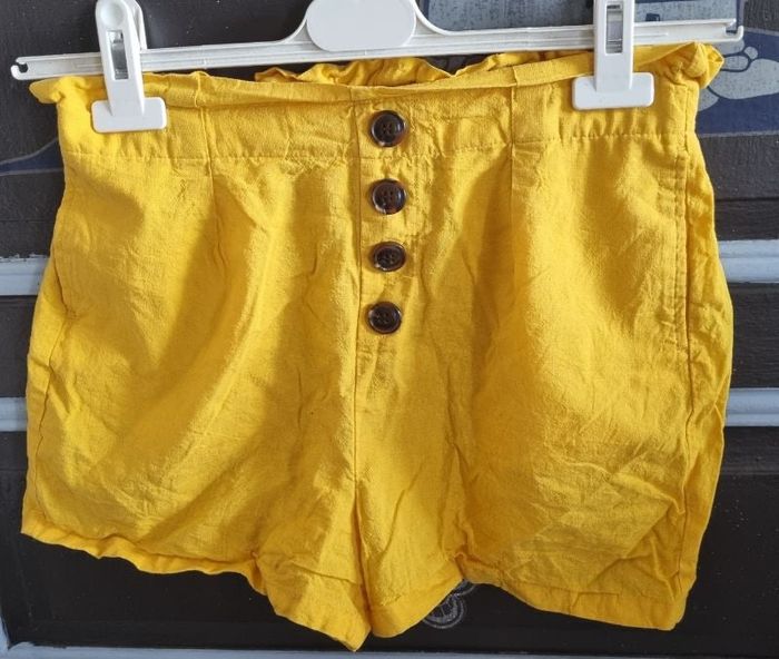 Short jaune élastique à la taille, faux boutons,taille XS 14ans marque Kiabi, longueur 34cm, largeur de la taille 34cm jusqu'à 40cm, largeur cuisse 31cm, léger.