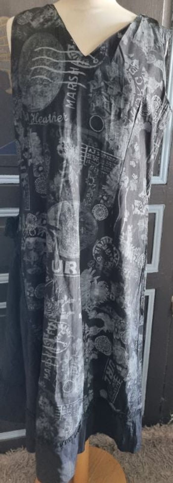 Robe imprimé sans manches, taille 44 marque Armand Thiery ,longueur 116cm, largeur 50cm, longueur épaule à aisselle 20cm, largeur aisselle à aisselle 51cm, largeur épaule à épaule 37cm.