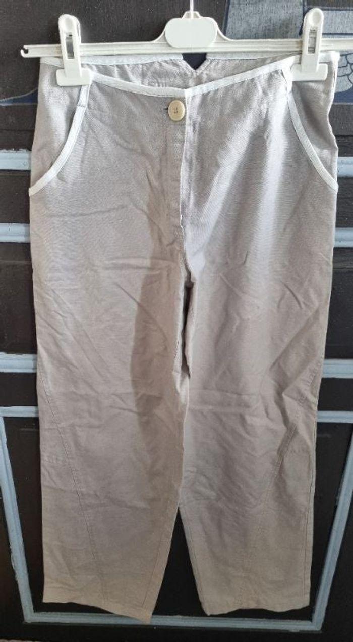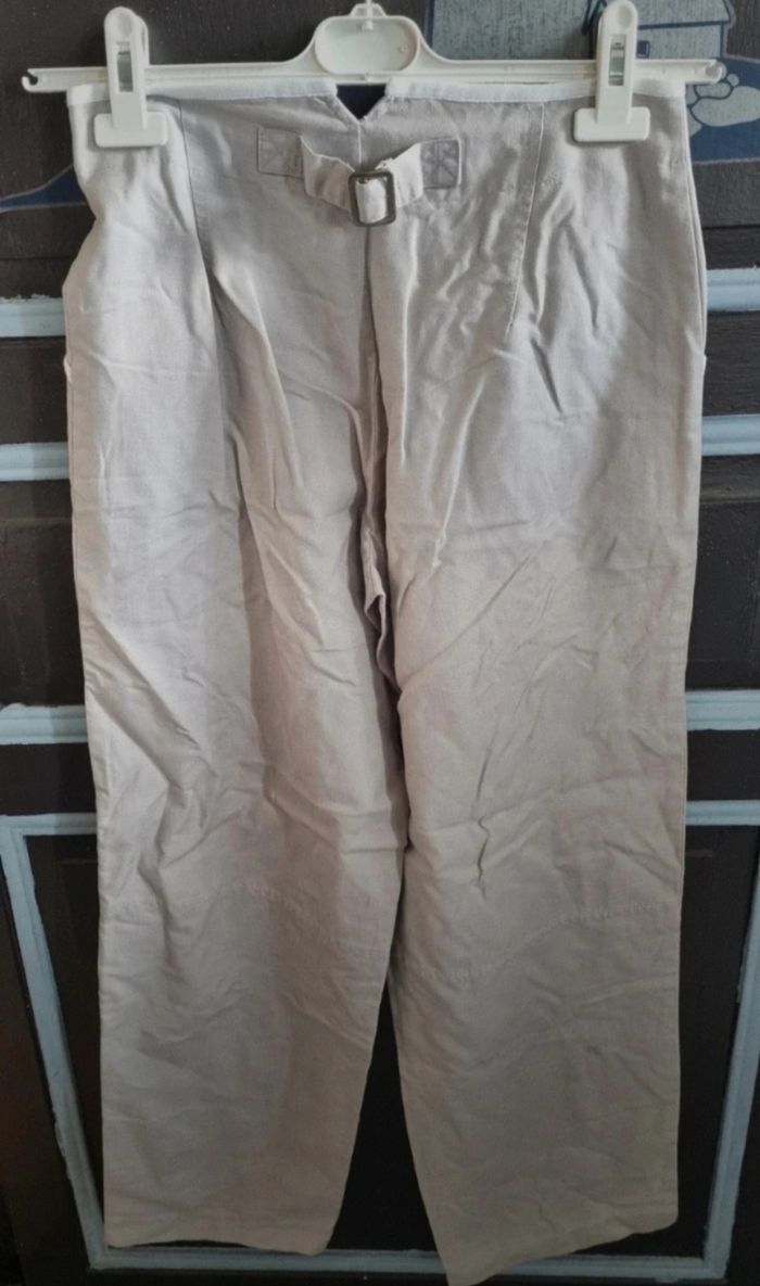 Pantalon gris à jambes larges taille 36,longueur 98cm, largeur de la taille 36cm, largeur cuisse 24cm, largeur cheville 23cm,fermeture zippée avec bouton,2 poches.