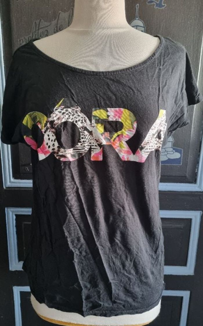 T-shirt noir avec écriture imprimée tropical, taille 4 marque Oôra by M pokora,longueur 63cm, largeur 48cm, longueur épaule à aisselle 17cm, largeur aisselle à aisselle 50cm.