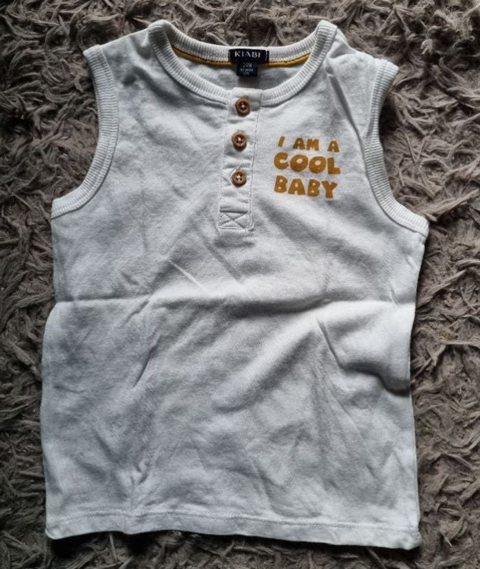 Débardeur blanc avec écriture, taille 24mois marque Kiabi.