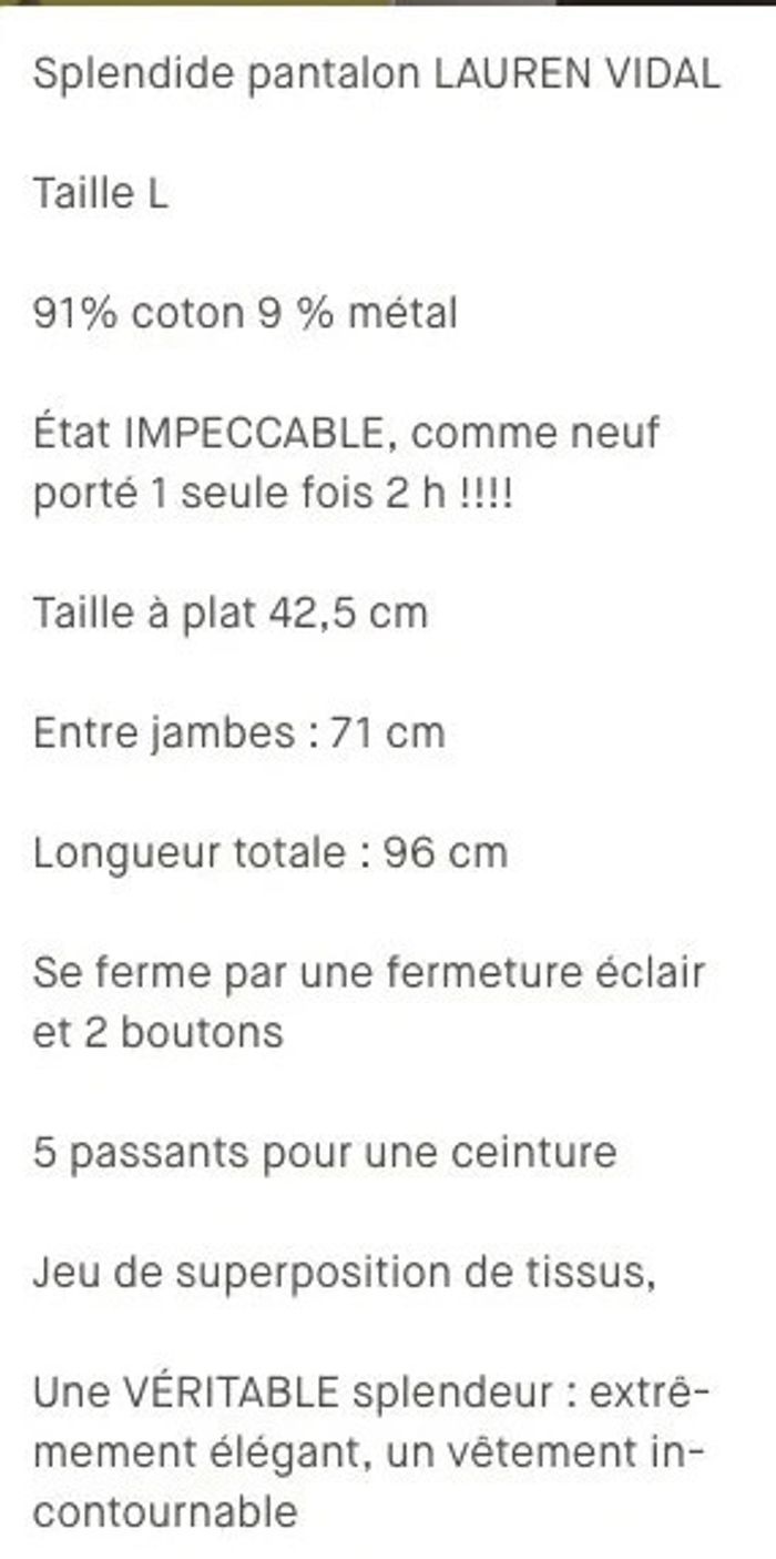 🤩🤩🤩🤩 Splendide pantalon LAUREN VIDAL Taille L voir mesures plus bas 🤩 91% coton 9 % métal État NEUF 🤩Mesures : Taille à plat 42,5 cm Entre jambes : 71 cm Longueur totale : 96 cm Se ferme par une fermeture éclair et 2 boutons 5 passants pour une ceinture Jeu de superposition de tissus, Une VÉRITABLE splendeur : extrêmement élégant, un vêtement incontournable #gabouilles