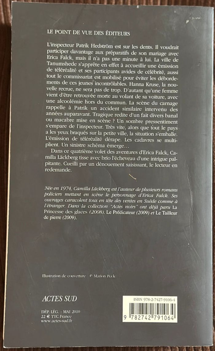 En parfait état Résumé L'inspecteur Patrik Hedström est sur les dents. Il voudrait participer davantage aux préparatifs de son mariage avec Erica Falck, mais il n'a pas une minute à lui. La ville de Tanumshede s'apprête en effet à accueillir une émission de téléréalité et ses participants avides de célébrité, aussi tout le commissariat est mobilisé pour éviter les débordements de ces jeunes incontrôlables. Hanna Kruse, la nouvelle recrue, ne sera pas de trop. D'autant qu'une femme vient d'être retrouvée morte au volant de sa voiture, avec une alcoolémie hors du commun. La scène du carnage rappelle à Patrik un accident similaire intervenu des années auparavant. Tragique redite d'un fait divers banal ou macabre mise en scène ? Un sombre pressentiment s'empare de l'inspecteur. Très vite, alors que tout le pays a les yeux braqués sur la petite ville, la situation s'emballe. L'émission de téléréalité dérape. Les cadavres se multiplient. Un sinistre schéma émerge... Caractéristiques Date de parution 05/05/2010 Editeur Actes Sud Collection Actes noirs Format Grand Format Présentation Broché Nb. de pages 365 pages Poids 0.468 Kg Dimensions 14,6 cm × 24,1 cm × 2,6 cm EAN 9782742791064 ISBN 978-2-7427-9106-4