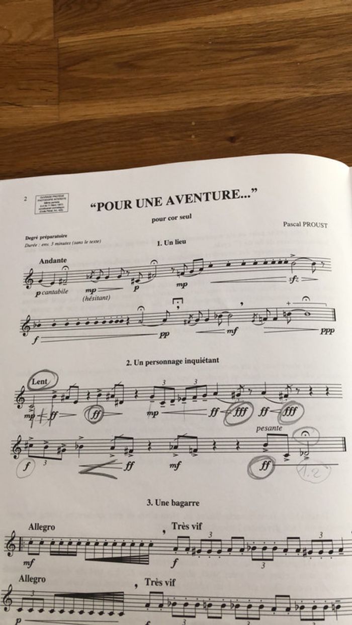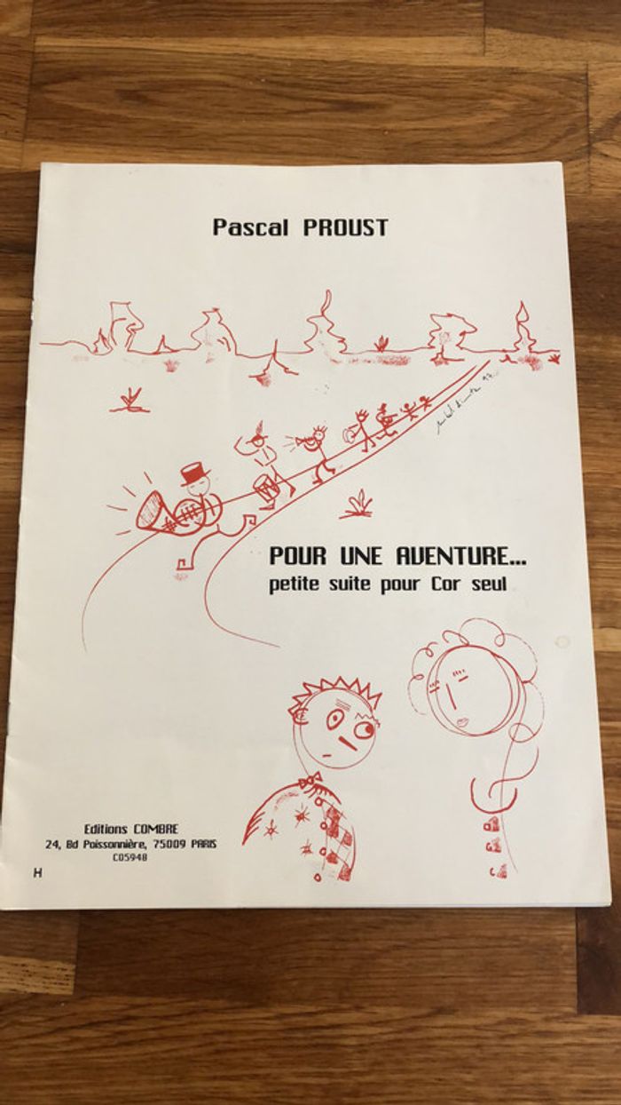 PROUST Pascal Pour une aventure - petite suite Discipline / Instrument : Cor seul Niveau : fin du 1er cycle Genre : classique Média : Partition Nombre de pages : 2 Editeur : Combre Partition annotée par la professeur du conservatoire au crayon de papier