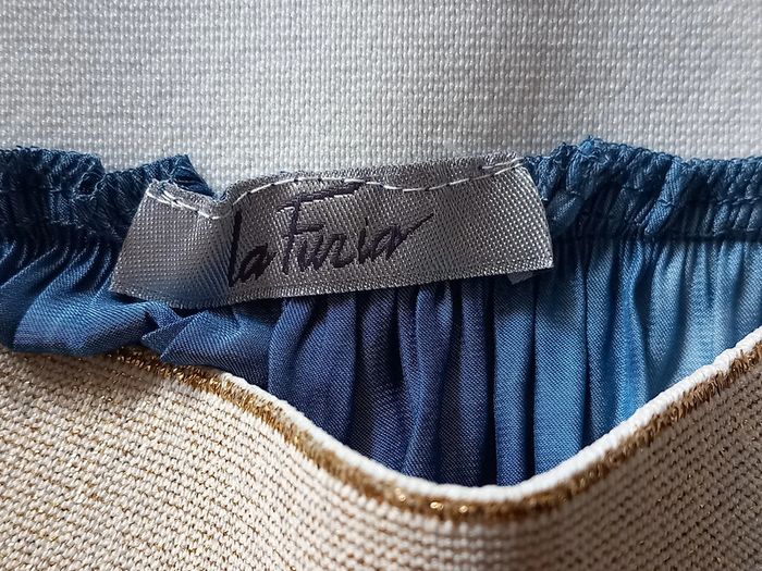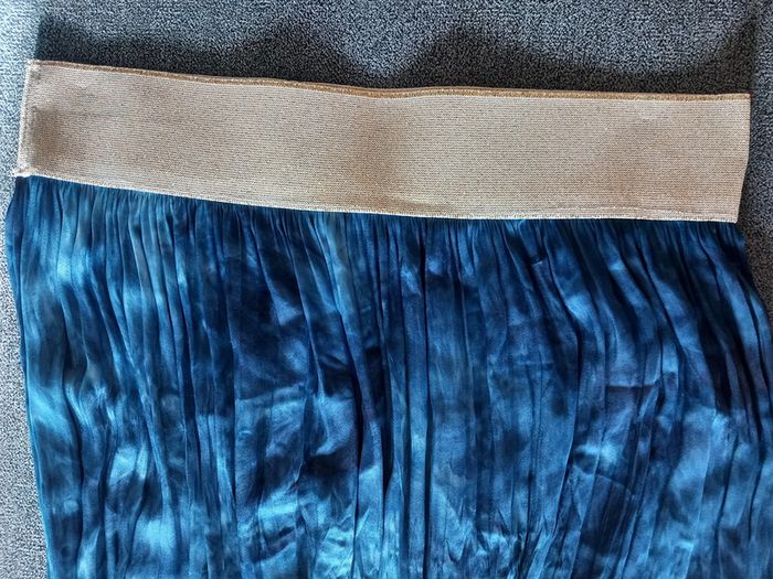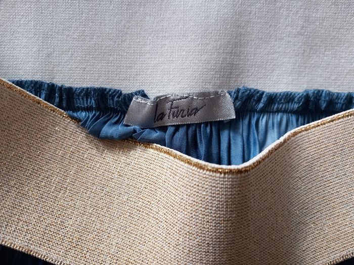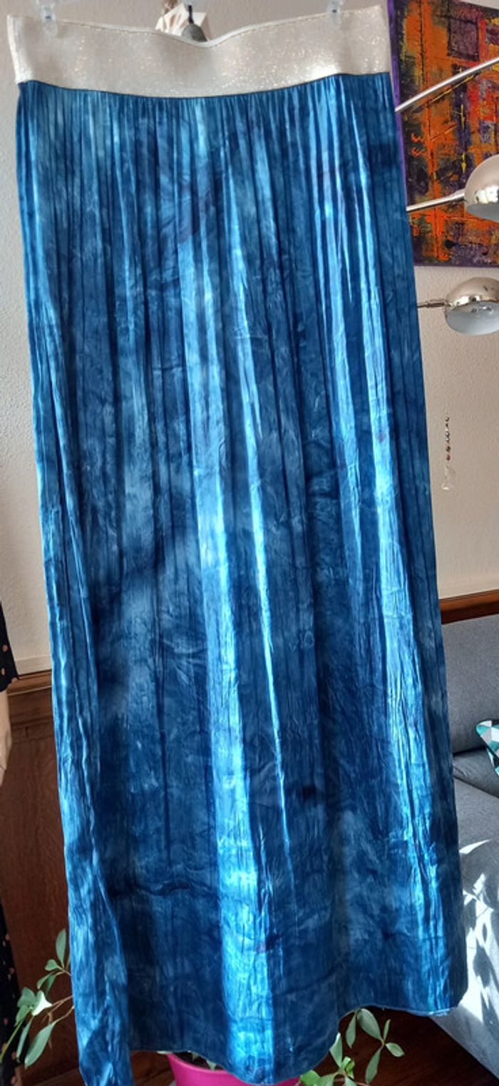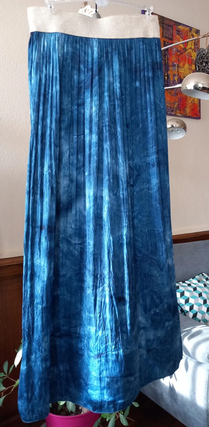 Très jolie jupe longue Beau coloris Bleu Taille élastiquée dorée Composition : Viscose et Elasthanne Taille : 36 Longueur totale : 93 cms Marque : La Furia #carlisle66femmetaille36