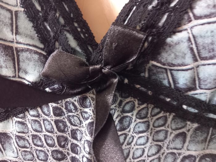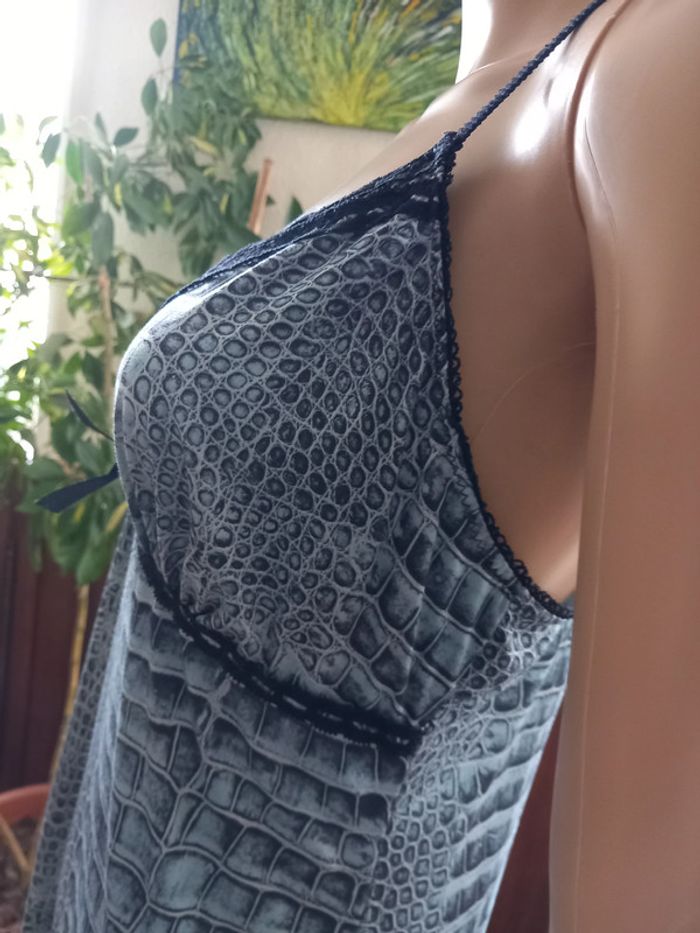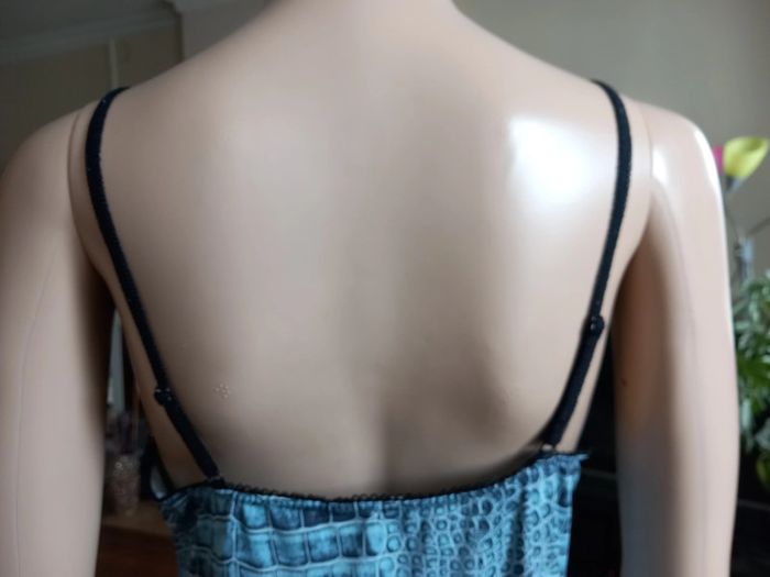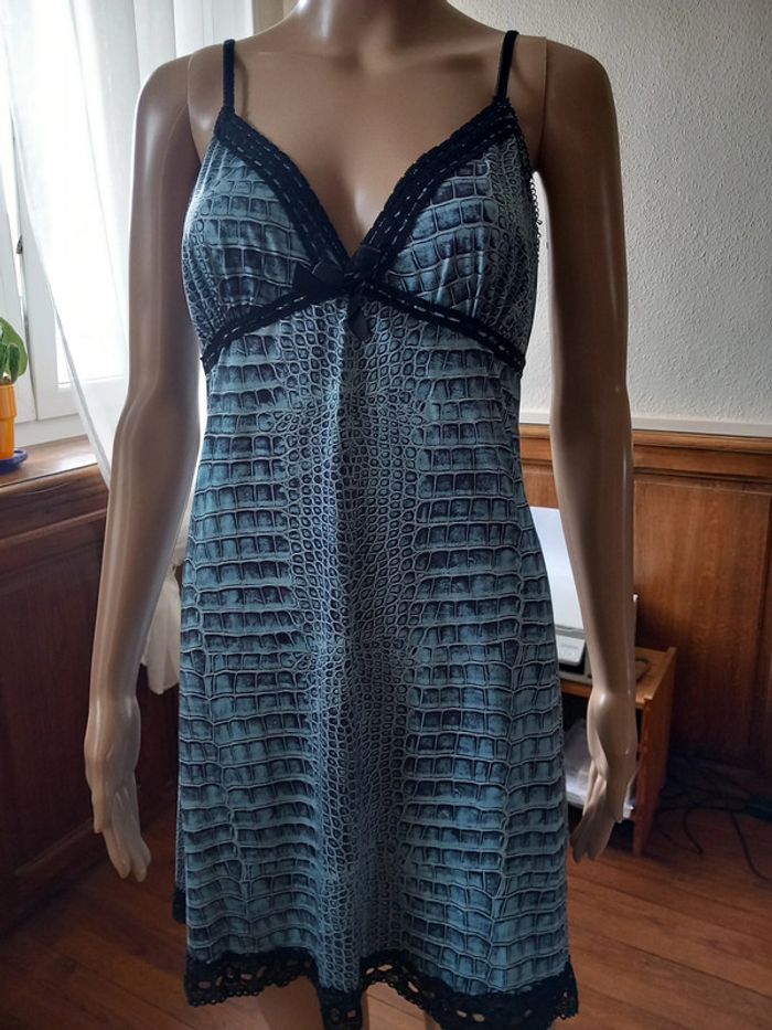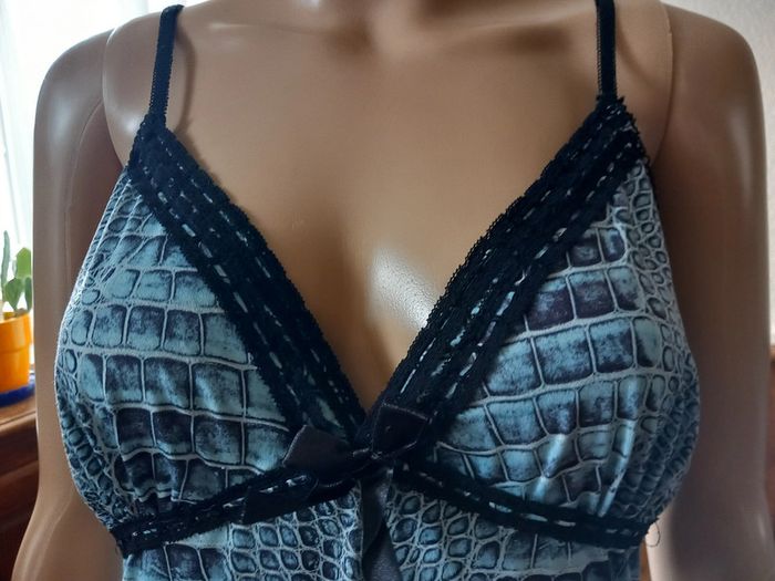 Jolie nuisette Taille : 38 Coloris : Sur fond bleu, motifs noirs et gris Bretelles réglables Dentelle sur le décolleté et le bas Etat impeccable #carlisle66lingerie