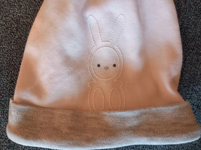 Joli bonnet, motif "petit lapin" Taille : 0/3 mois Coloris : Blanc, petit revers gris très clair, motif "petit lapin" Composition : 100% Coton Etat impeccable #carlisle66garçon1mois