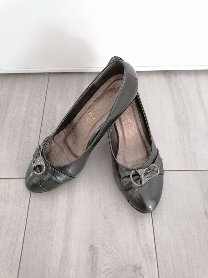 Vends escarpins synthétique vernis de couleur anthracite chromé (semelle intérieure cuir). Portés fréquemment mais en bon état. Signes d'usures sur les semelles et tampons, petit accro sur le devant de la chaussure droite.
