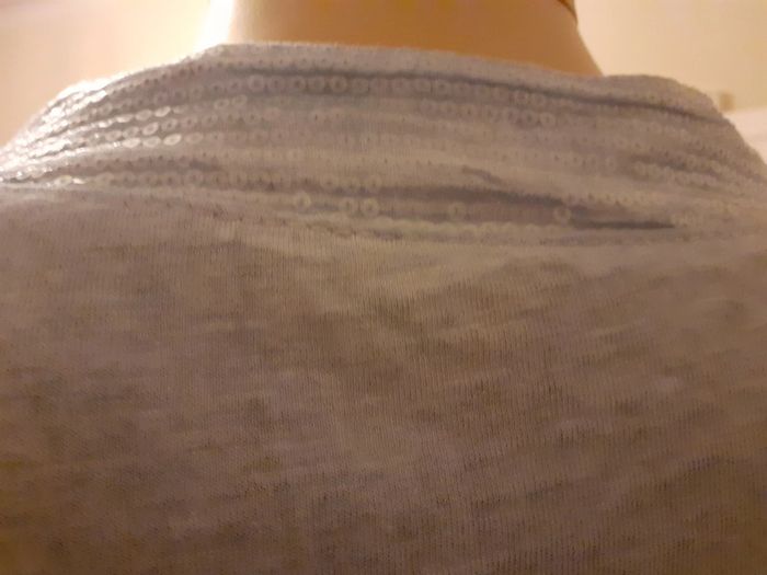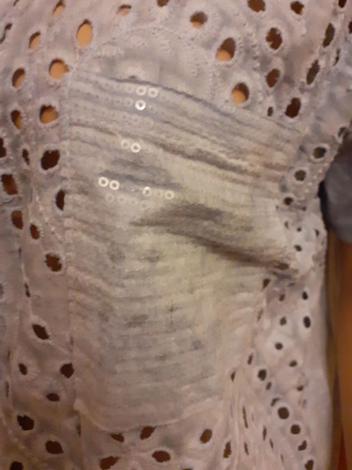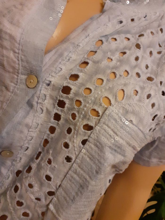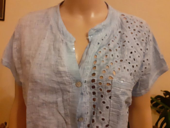 Jolie chemise à manches courtes Fermeture par petits boutons Légèrement ajourée sur un seul côté 1 poche plaquée avec sequins Taille : 38 Coloris : Bleu ciel Etat impeccable #carlisle66femmetaille38