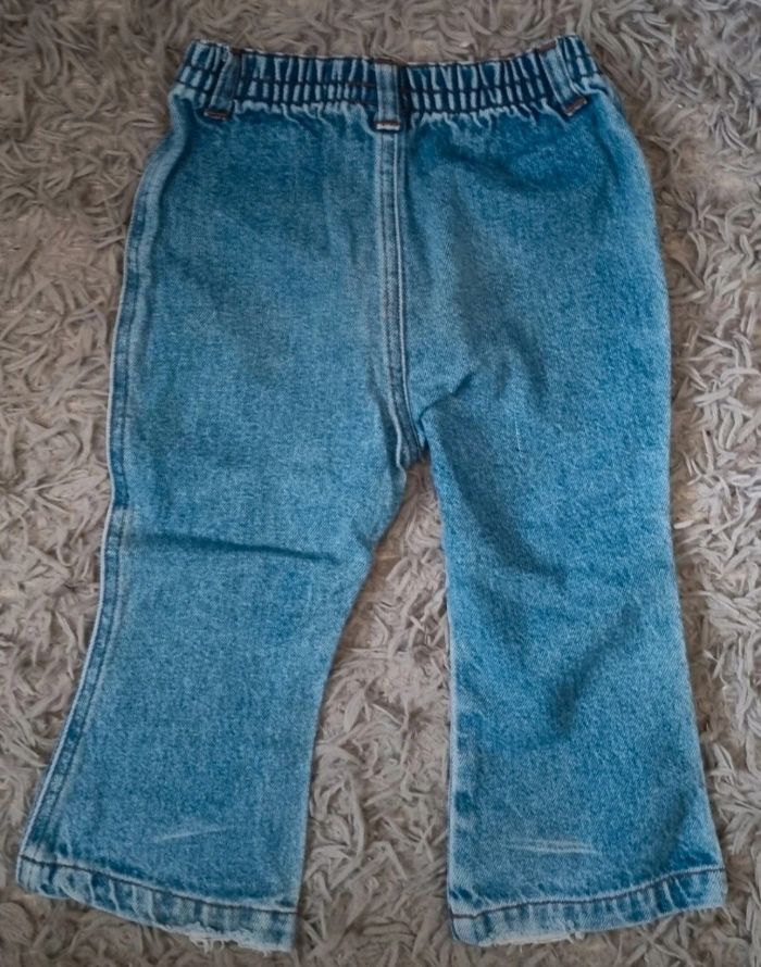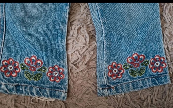 Jean taille 18mois, fleurs brodée aux chevilles, fausse poches, légèrement usé aux chevilles.