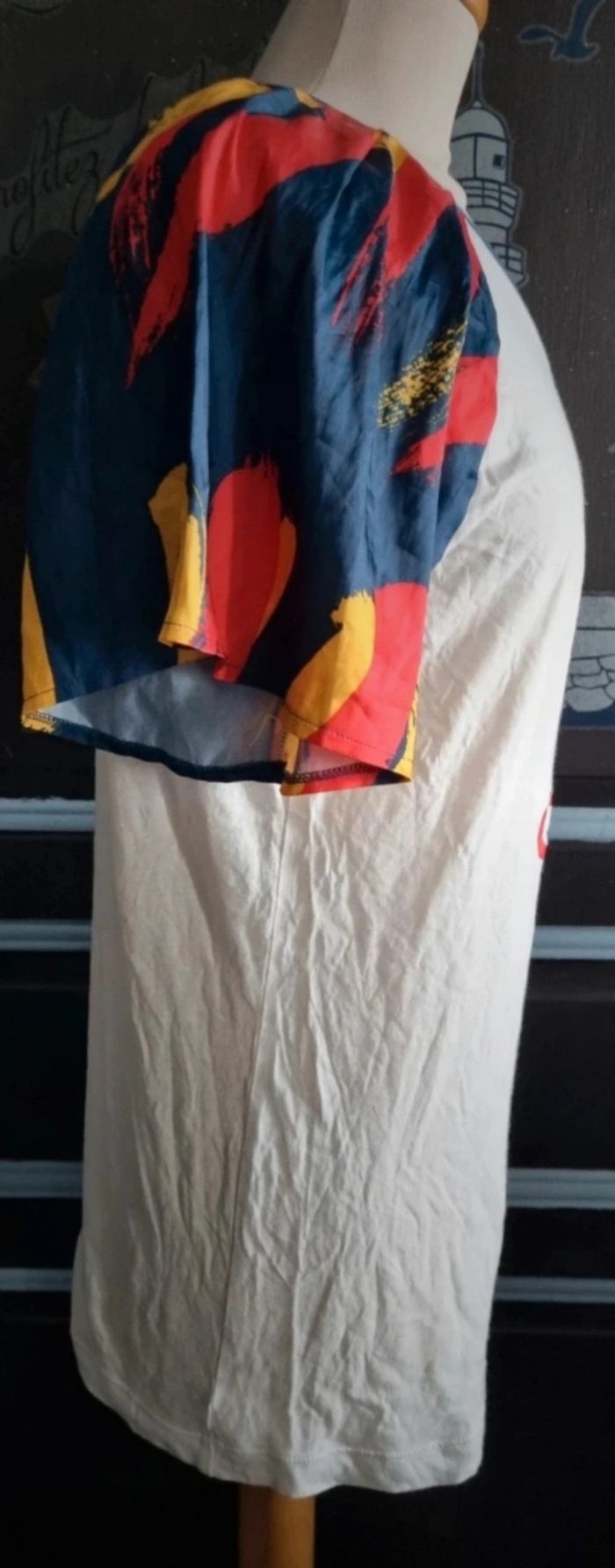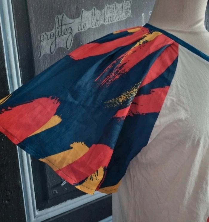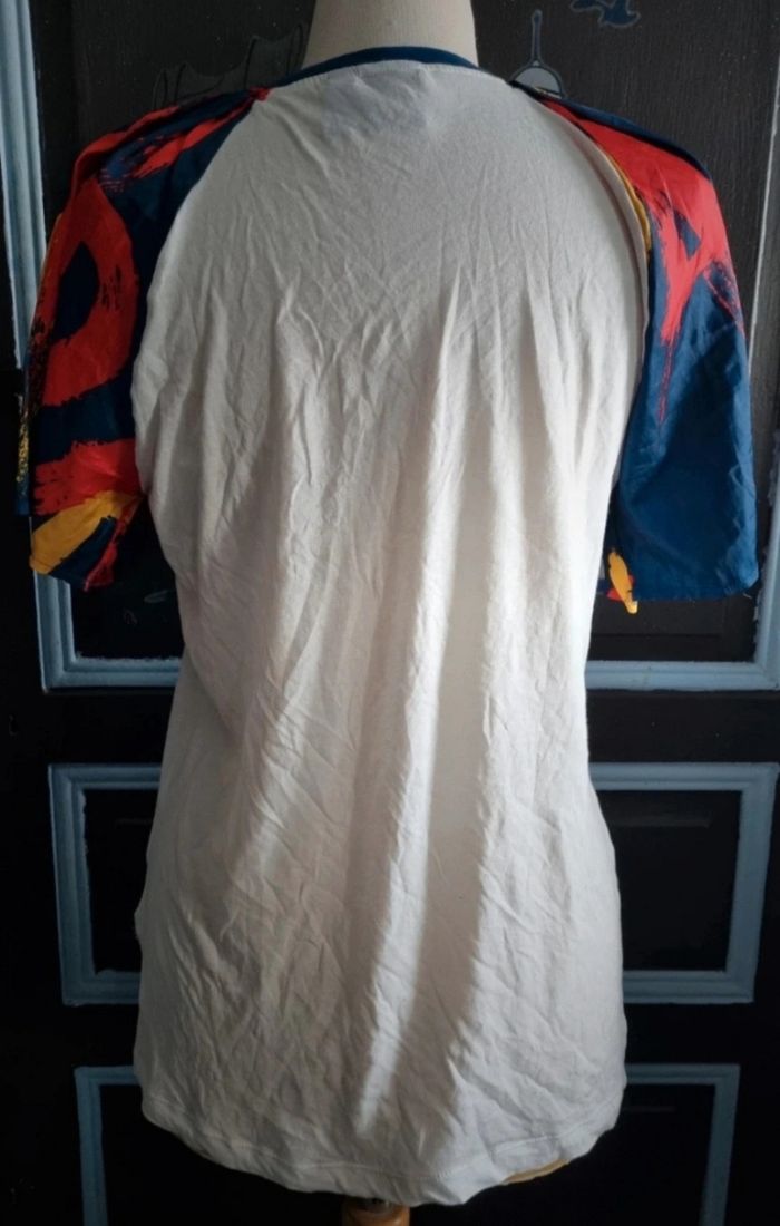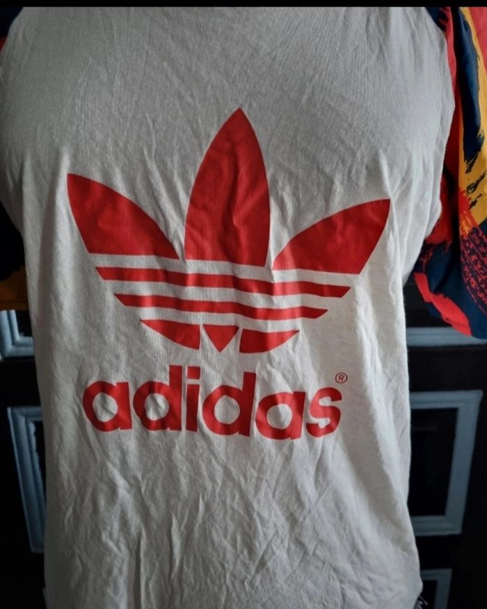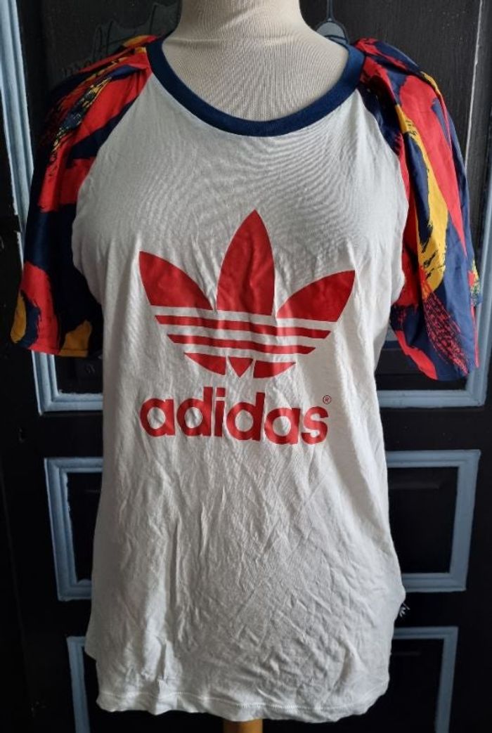 T-shirt Adidas taille 36,manches parachute à motifs,longueur 67cm, largeur 48cm, longueur épaule à aisselle 28cm, largeur aisselle à aisselle 48cm, largeur manche 30cm.