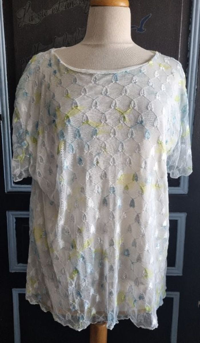 Blouse à manches courtes taille XL-2XL à motif avec voilage intégré,longueur 67cm, largeur 55cm, longueur épaule à aisselle 20cm, largeur aisselle à aisselle 53cm.