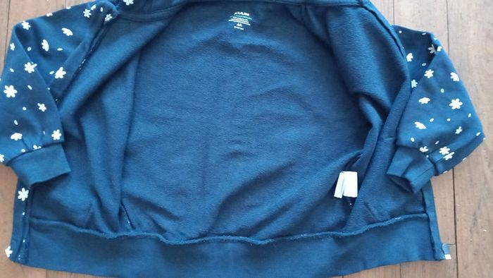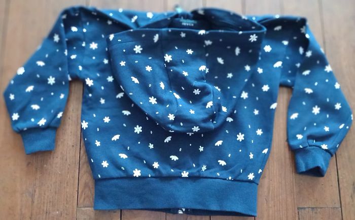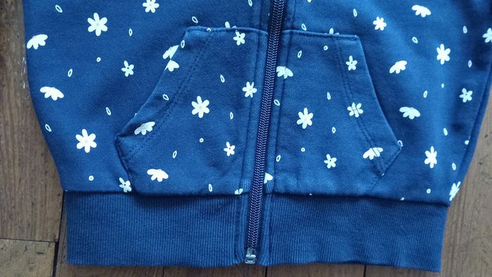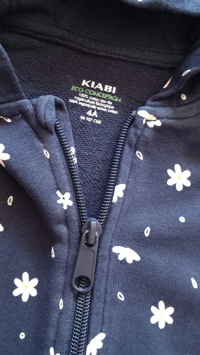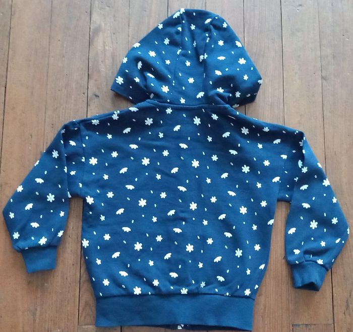 Joli gilet à capuche Coloris : Bleu marine, motif blanc Fermeture zippée 100% Coton Taille : 4 ans Marque : Kiabi Etat impeccable #carlisle66fille4ans