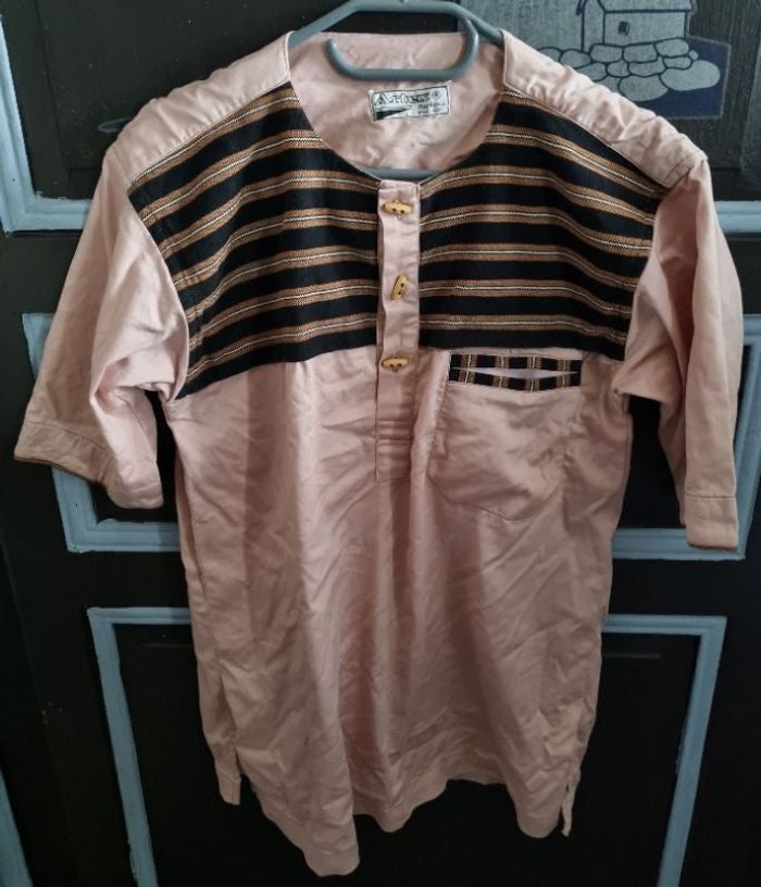 Tunique homme taille L ,marque Artex Burkina,rose clair avec rayures,longueur 70cm, largeur 52cm, longueur épaule à aisselle 20cm, largeur aisselle à aisselle 51cm.