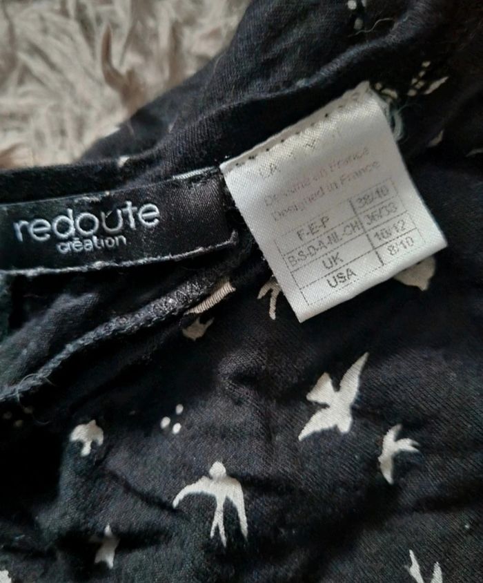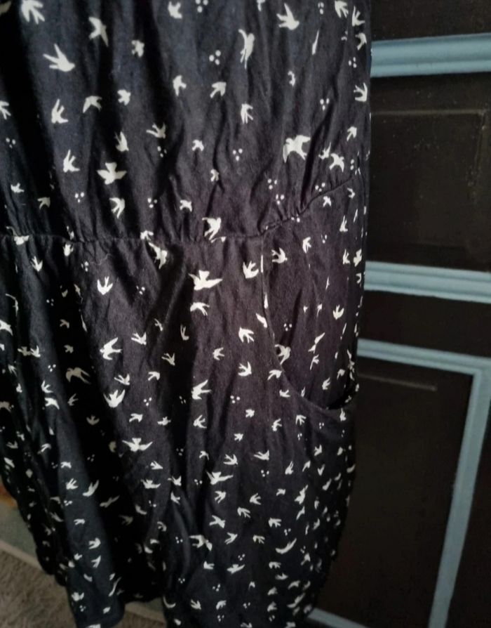 Robe tunique noir à motifs hirondelles avec poches, taille 38-40 marque La redoute,élastique à la taille,manches ¾,longueur 91cm, largeur 35cm jusqu'à 50cm, longueur épaule à aisselle 20cm, largeur aisselle à aisselle 46cm, largeur épaule à épaule 40cm, longueur manche 28cm,très bonne état voir neuf car très peut porté.