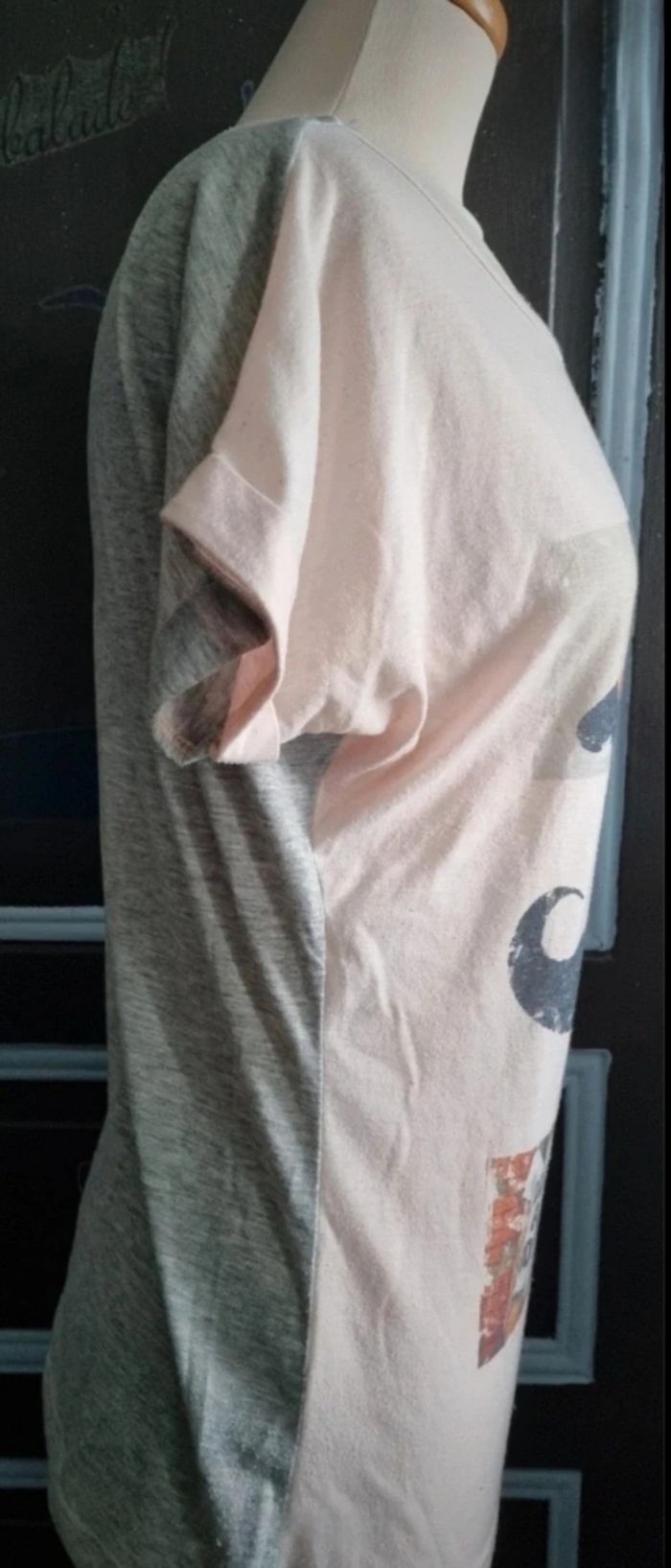 T-shirt imprimé style vintage rose pale et gris,taille L marque Cache-cache,longueur 65cm, largeur 45cm, longueur épaule à aisselle 19cm, largeur aisselle à aisselle 50cm.