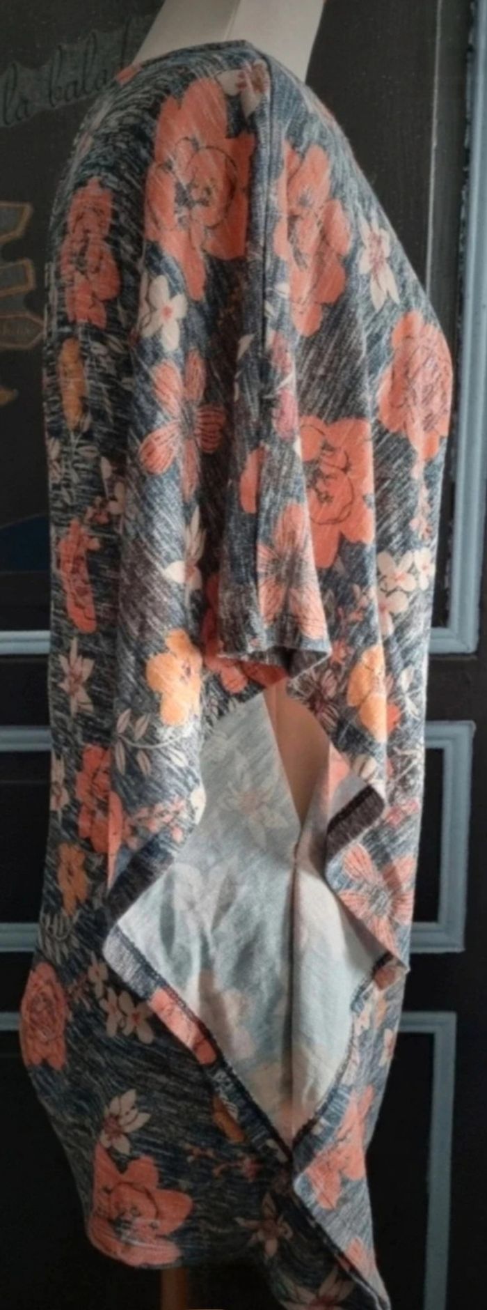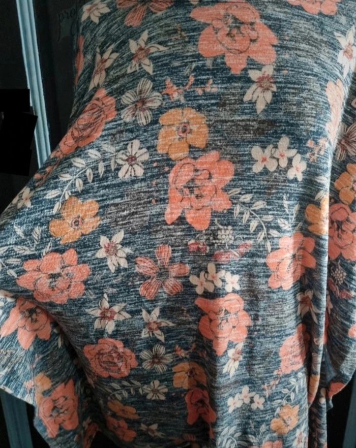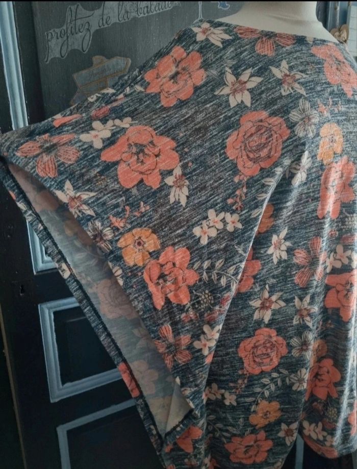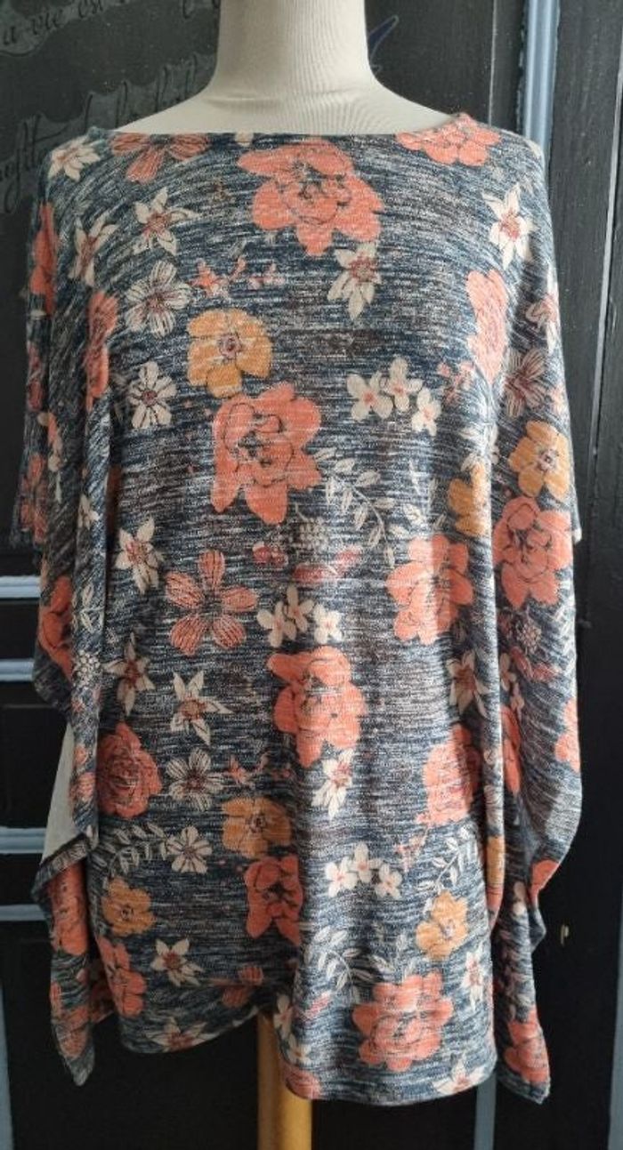 Poncho taille unique gris a motif fleurs,léger,longueur 76cm, largeur 66cm, longueur épaule à aisselle 47cm.