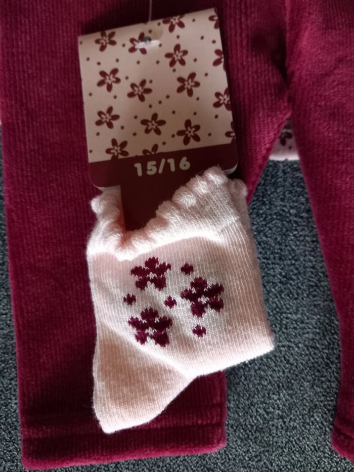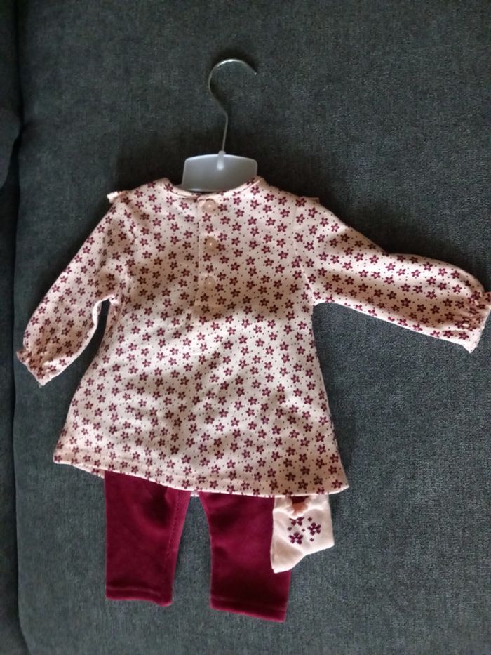Joli ensemble composé d'une tunique, un legging et une paire de chaussette Compositon : 59% Coton, 41% Polyester Petit bouton de remplacement cousu sur étiquette Jamais porté Etat impeccable #carlisle66fille3mois