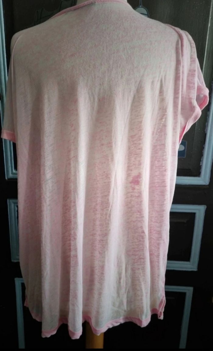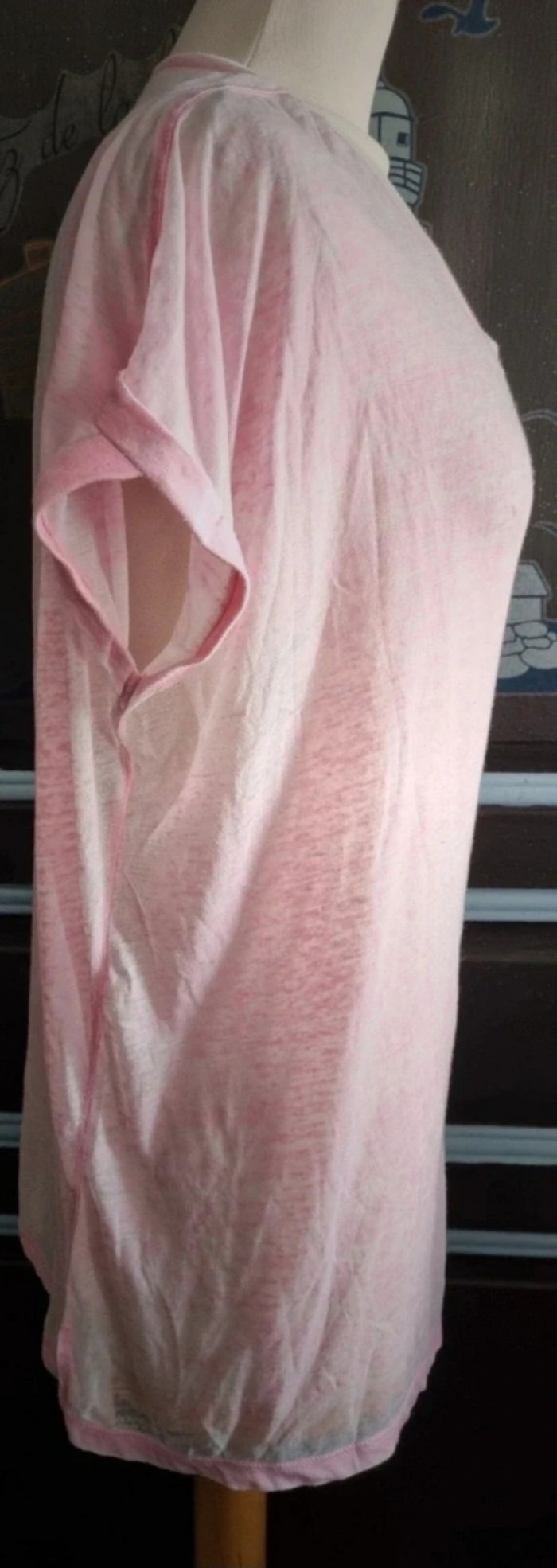 T-shirt léger et transparent rose à reflet blanc,taille L marque Kiabi, longueur 68cm, largeur 60cm, longueur épaule à aisselle 19cm, largeur épaule à épaule 71cm.