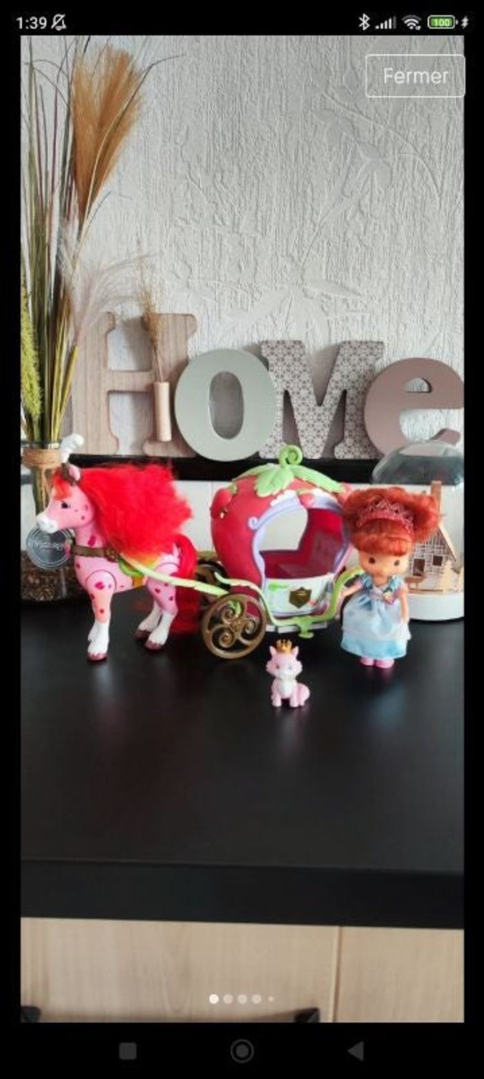 Superbe carrosse princesse charlotte aux fraises cendrillon de collection vintage dessin animé manga kawaii année 80 porte qui s'ouvre Poupée mannequin Princesse ( valeur seule 15€) robe bustier corset manche courte tulle transparent dentelle couronne 👑 chaussures cheval poney caramiel chat animaux pralinette ( valeur seule 10€) collier jeu jouet enfant bébé fille garçon De couleur rose vert jaune doré or bleu roux feuille motif dessin animé fruit légèrement décoloré avec le temps mais tout casiment neuf