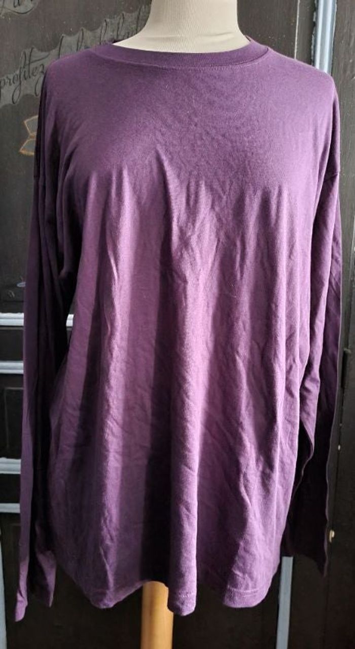 T-shirt manches longues taille XL violet, 100%coton, longueur 74cm,largeur 59cm, longueur épaule à aisselle 25cm, longueur manches 60cm,largeur aisselle à aisselle 64cm .