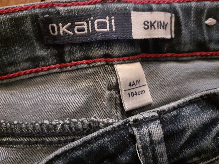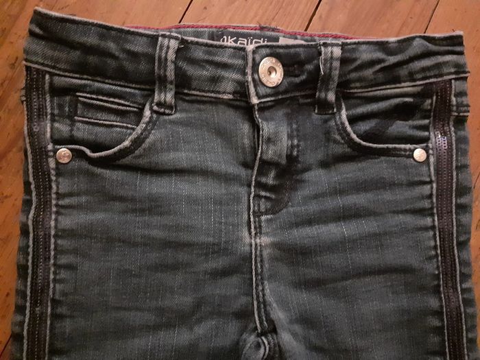 Joli jean skinny Taille : 4 ans Coloris : Noir Petite bande de séquins sur les côtés Composition : Coton et Elasthanne Boutons de réglage à la ceinture si nécessaire Marque : Okaïdi Etat impeccable #carlisle66fille4ans