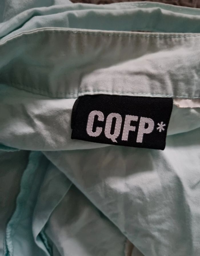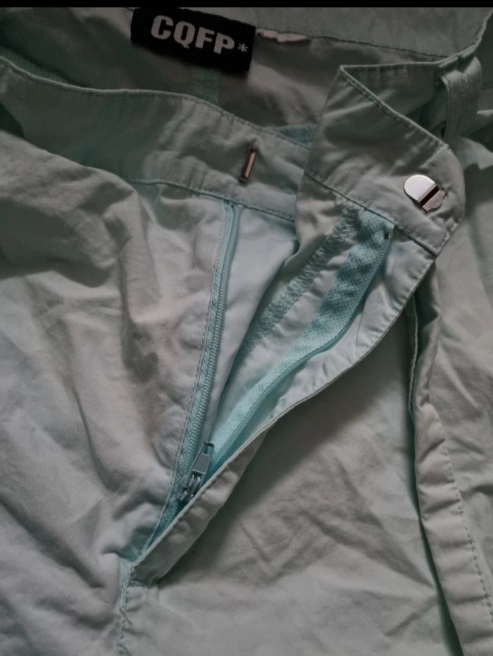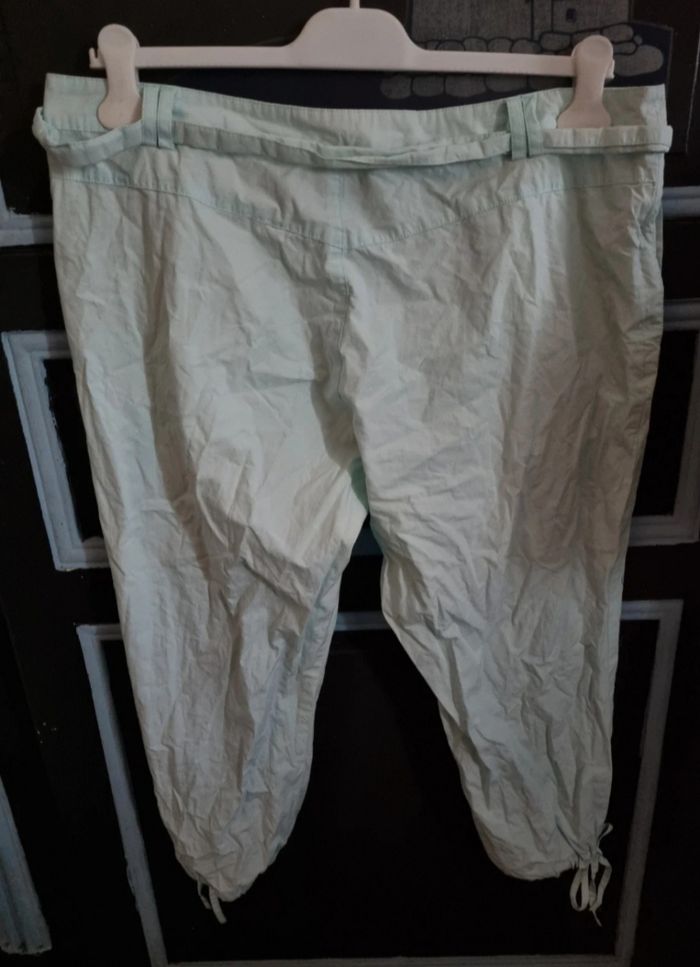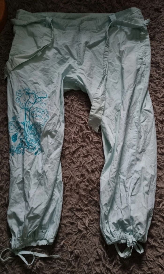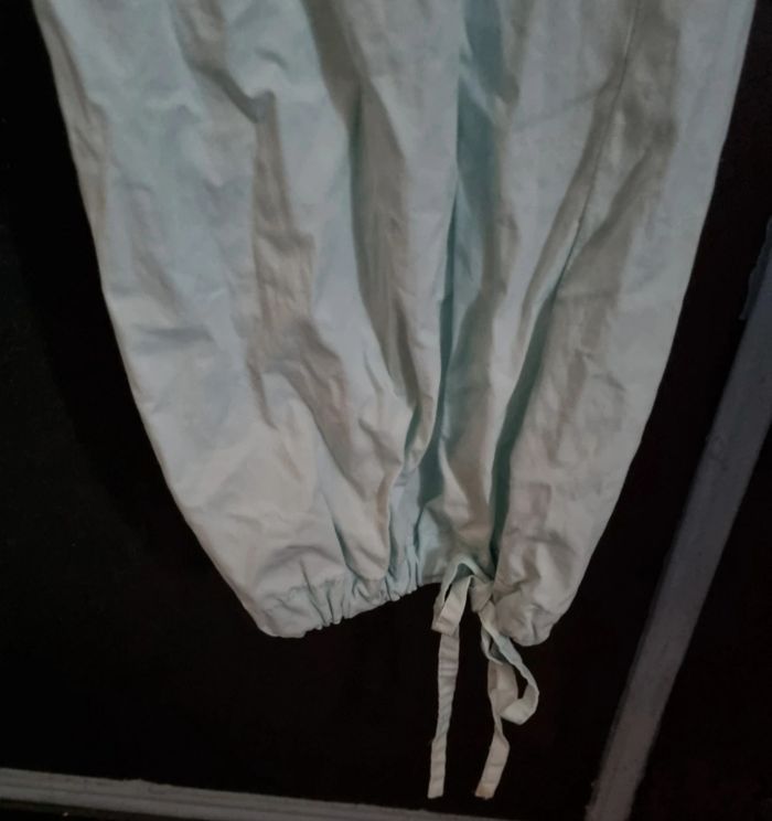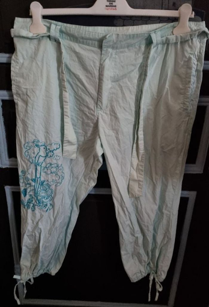 Pantacourt turquoise à reflet blanc, avec motif brodé ,taille 48 marque CQFP ,réglable au cheville avec cordon et à la taille avec ceinture, longueur 80cm, largeur de la taille 48cm,largeur cuisse 30cm, largeur cheville 15cm jusqu'à 22cm.