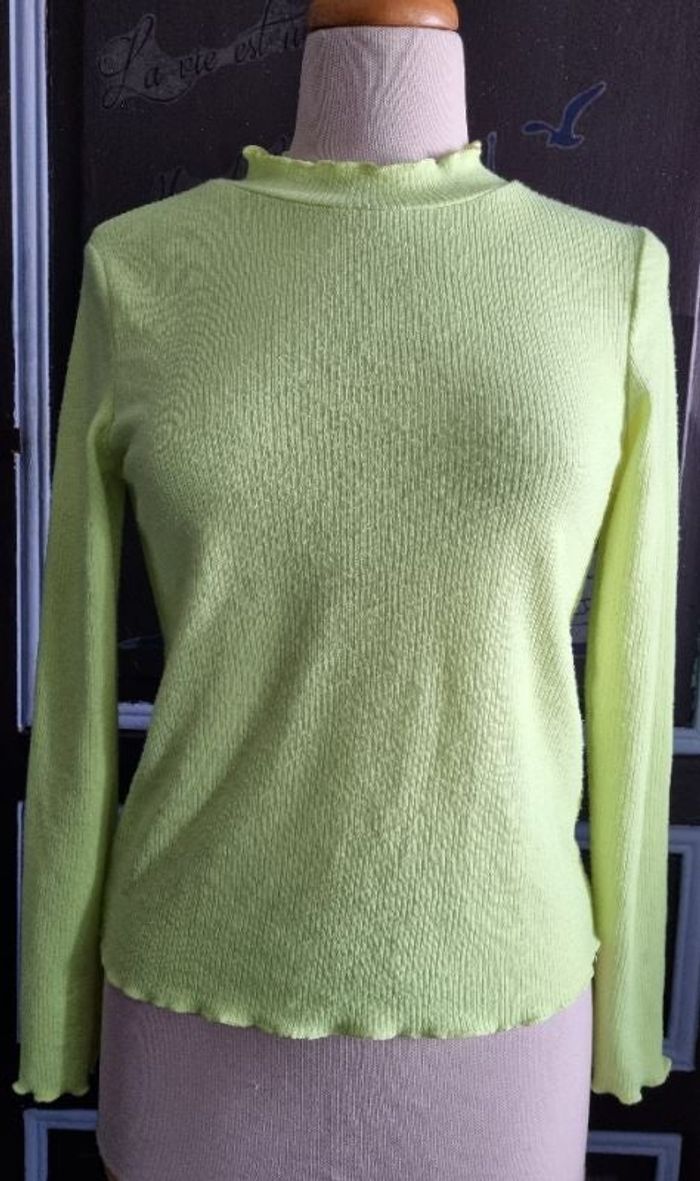 Pull jaune fluo,taille S marque Pimkie, 100%polyester,longueur 55cm, largeur 42cm, longueur épaule à aisselle 20cm, largeur aisselle à aisselle 44cm, longueur manche 45cm.