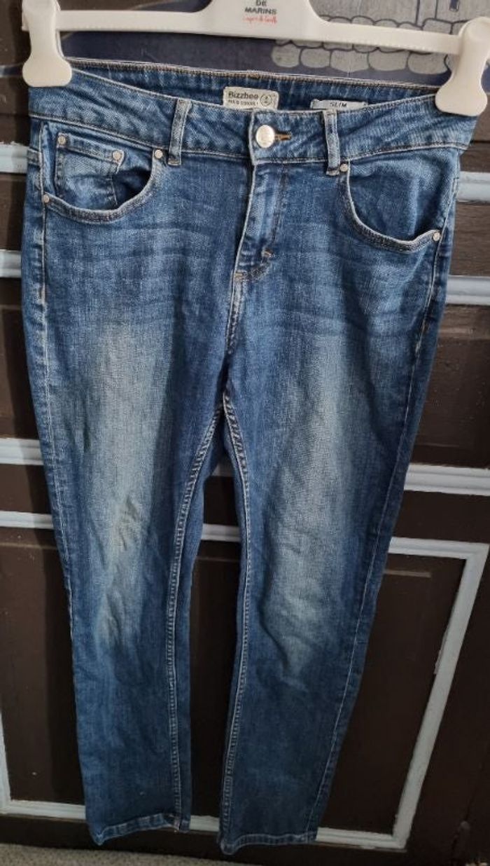 Jeans slim effet délavé, taille 38 marque Bizzbee, se ferme à zip et bouton,longueur 94cm, largeur de la taille 38cm, largeur cuisse 25cm, largeur cheville 14cm.