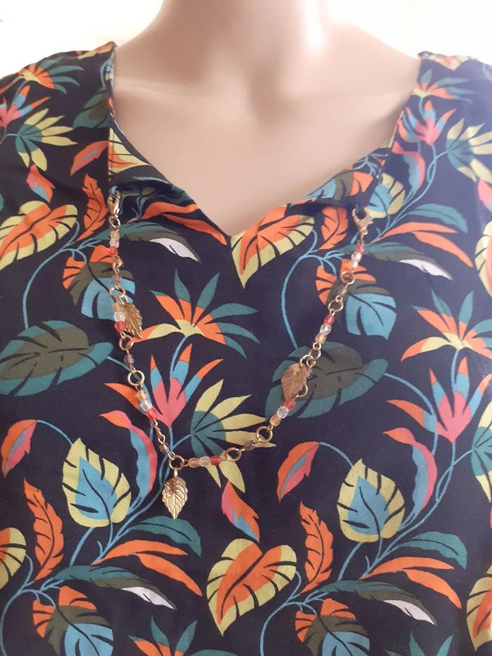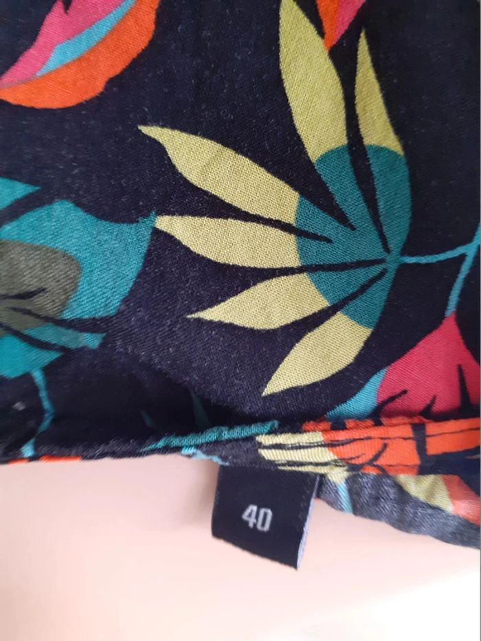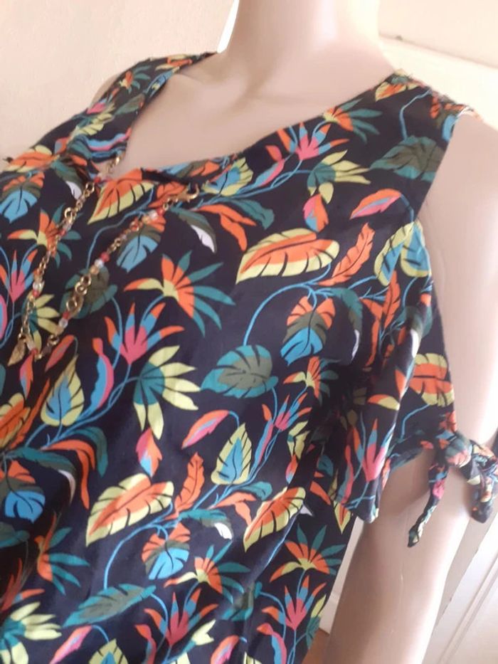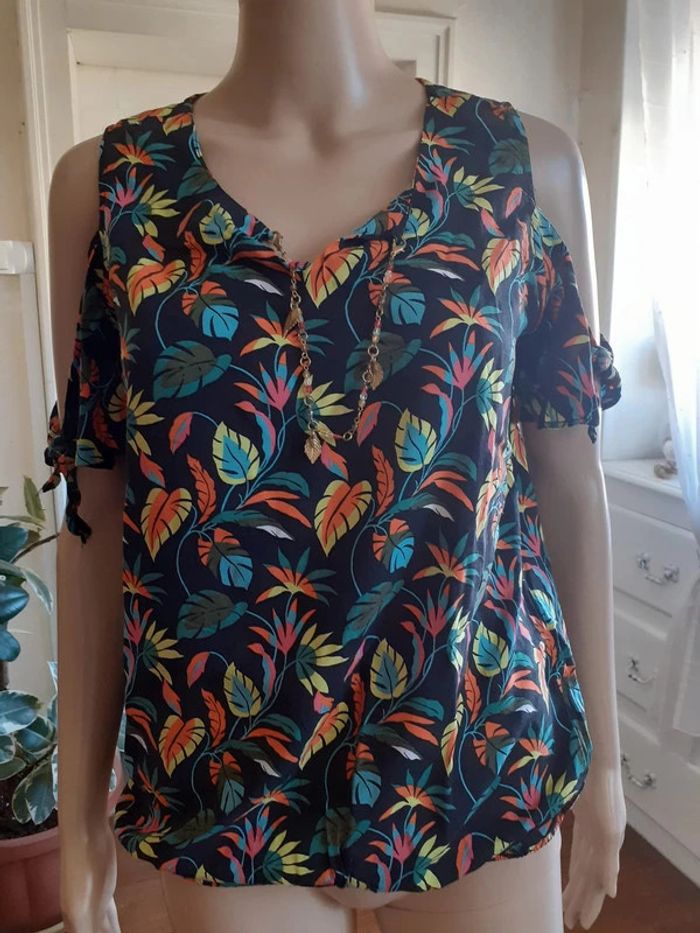 Jolie blouse aux épaules découvertes Petit bijou à l'encolure Composition : 100% Viscose Taille : 40 Coloris : sur fond noir, motifs fleuris très colorés Etat impeccable #carlisle66femmetaille40
