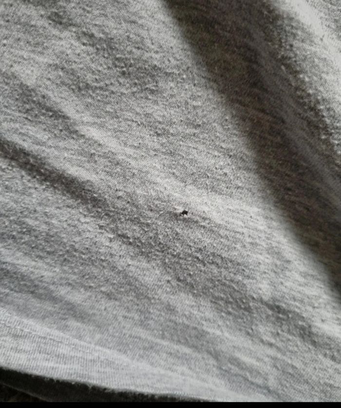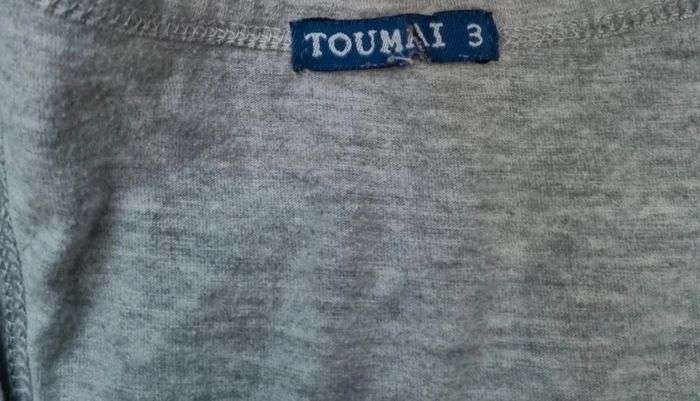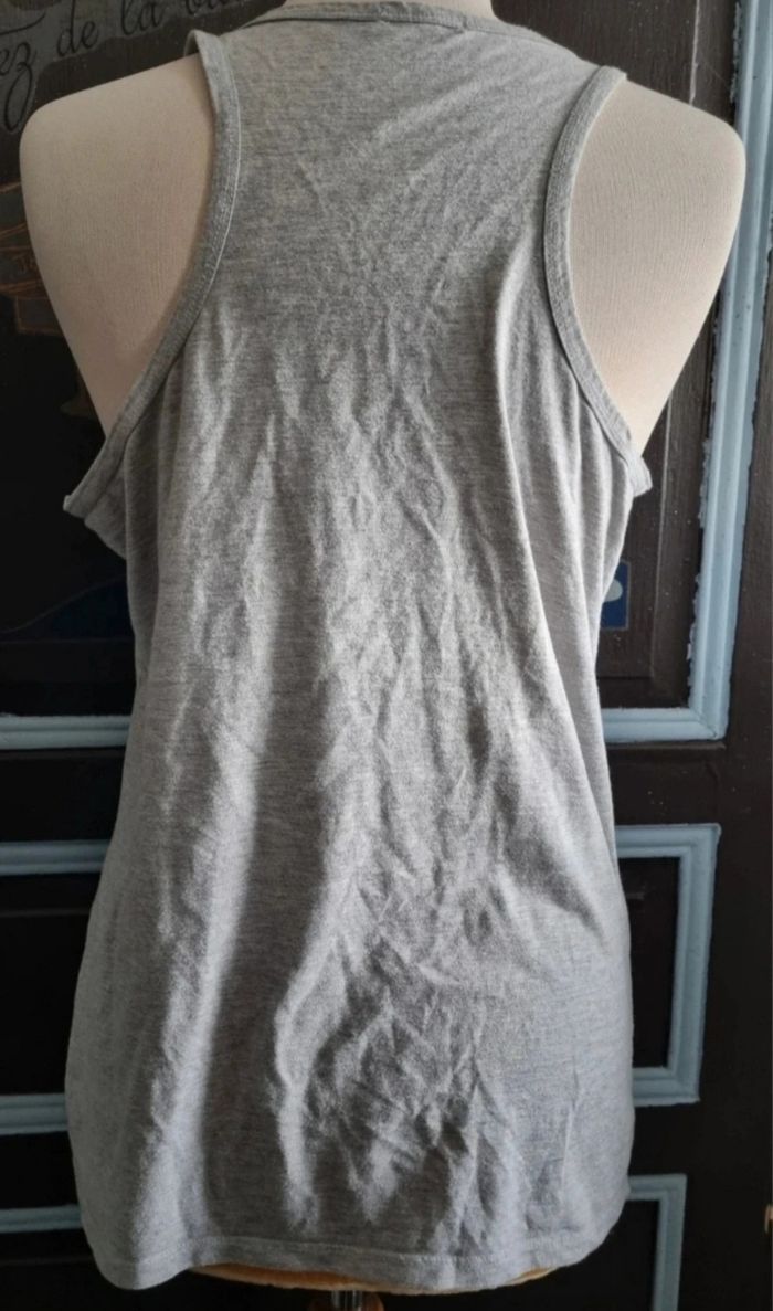 Débardeur gris avec strass,taille 3 marque Toumaï, longueur 68cm, largeur 49cm, longueur épaule à aisselle 21cm, largeur aisselle à aisselle 51cm,une légère tache et mini trou voir photos.