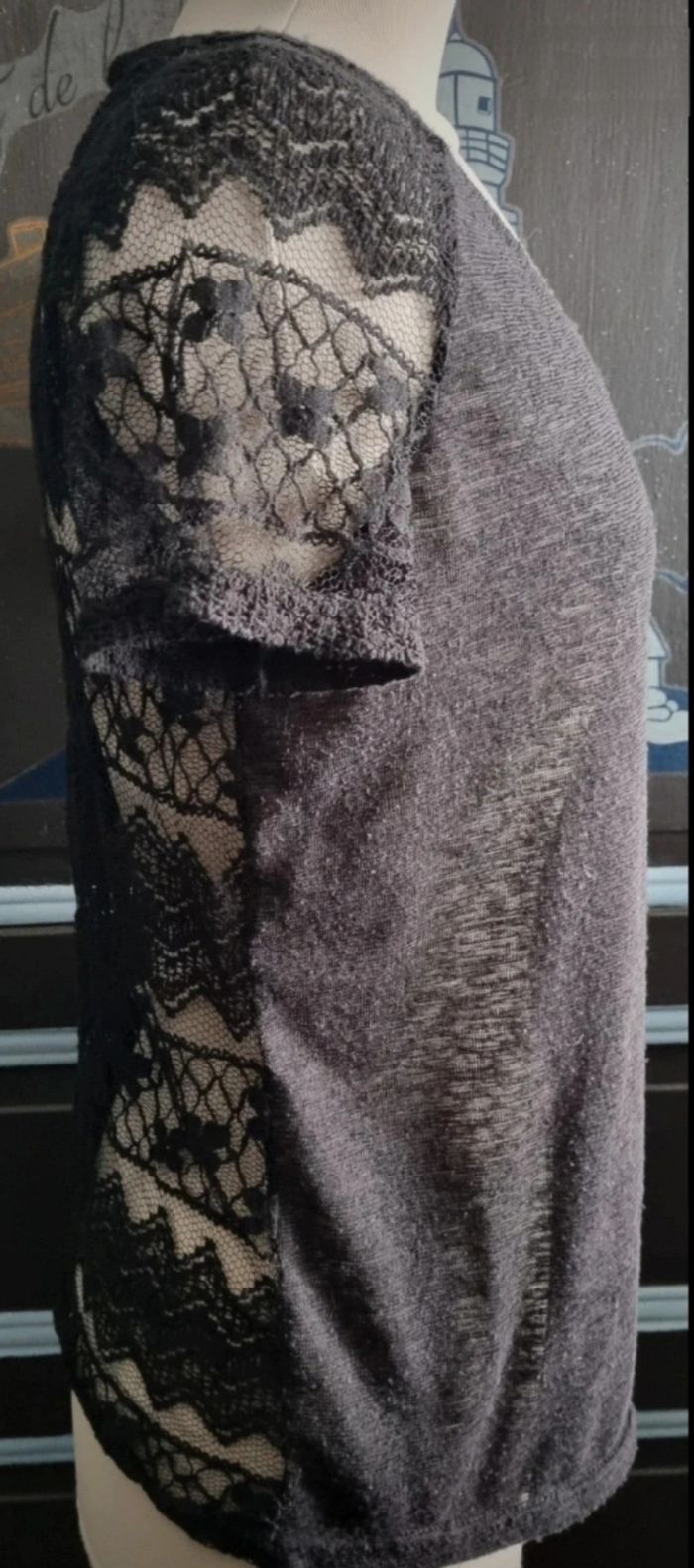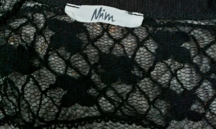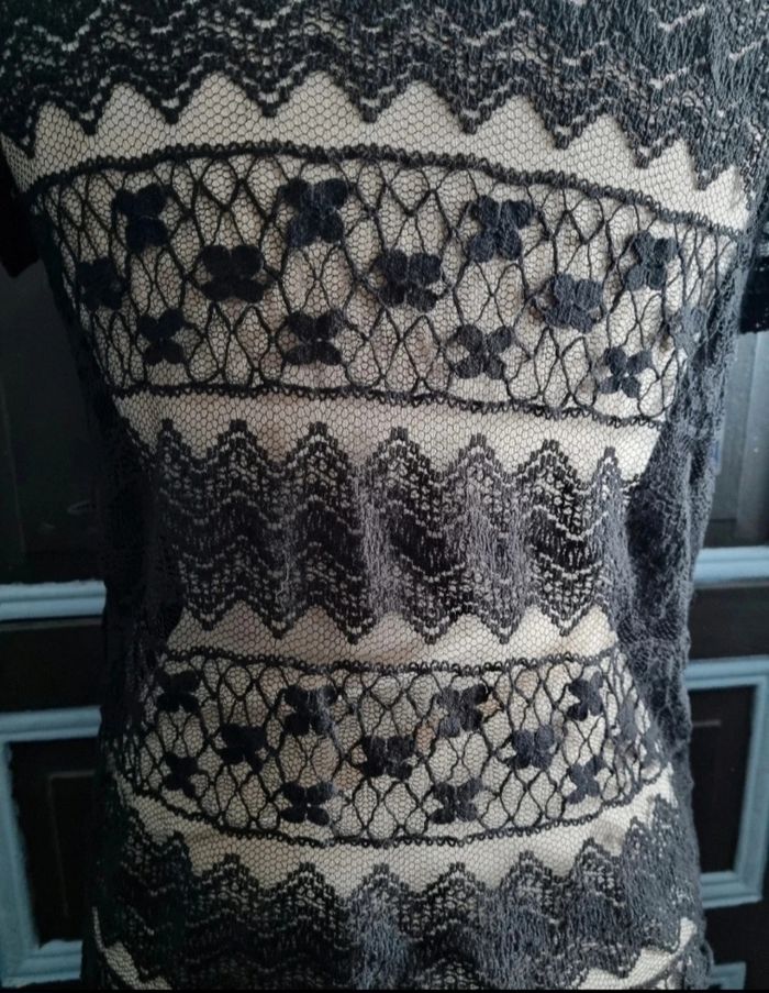 T-shirt léger et transparent avec broderie à motif (trèfle),taille L marque Mim,longueur 60cm, largeur 45cm, longueur épaule à aisselle 15cm, largeur aisselle à aisselle 45cm.