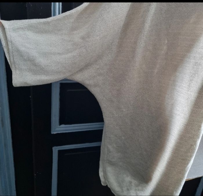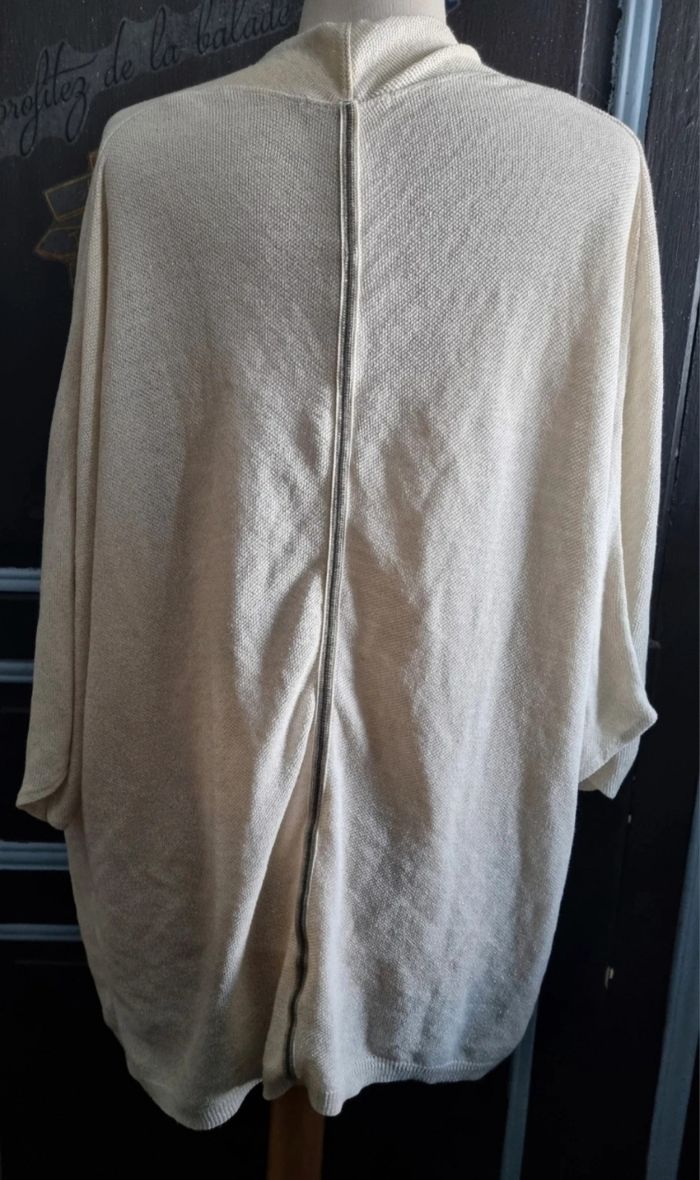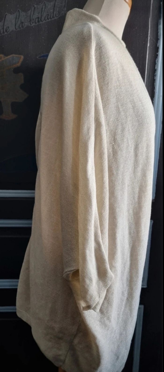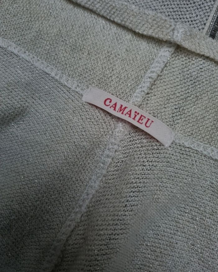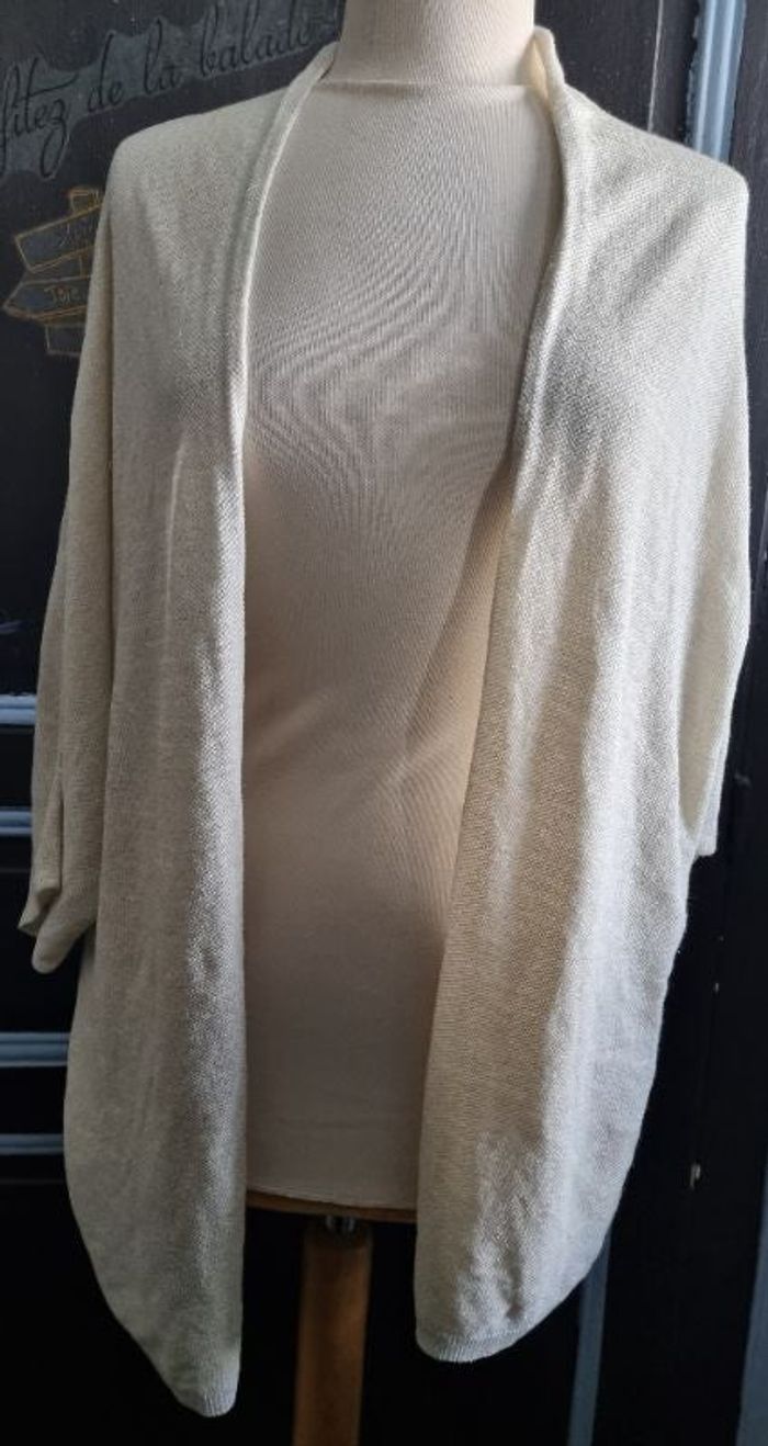 Cardigan manches ¾ ,taille 40,marque Camaïeu, blanc crème pailleté avec strass dans le dos,(mesures approximative)longueur 68cm, largeur 50cm, longueur épaule à aisselle 30cm, longueur manche 22cm.