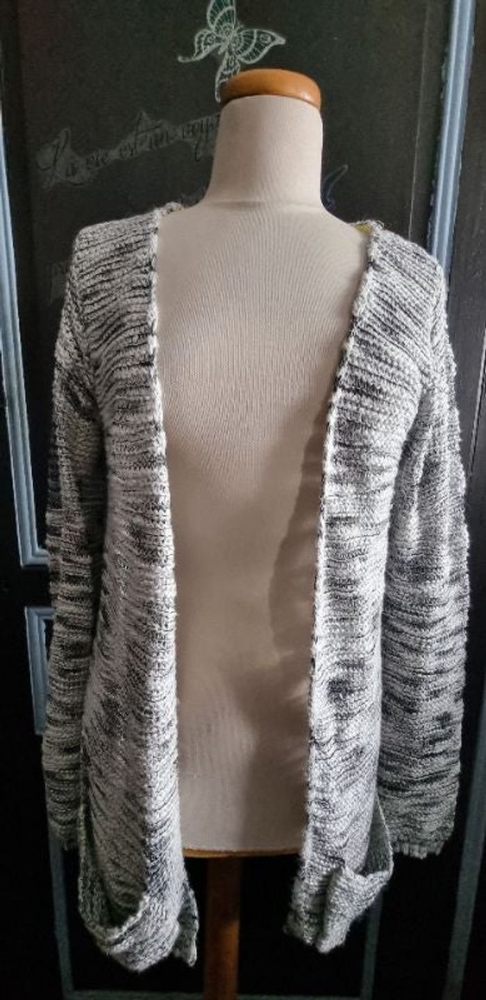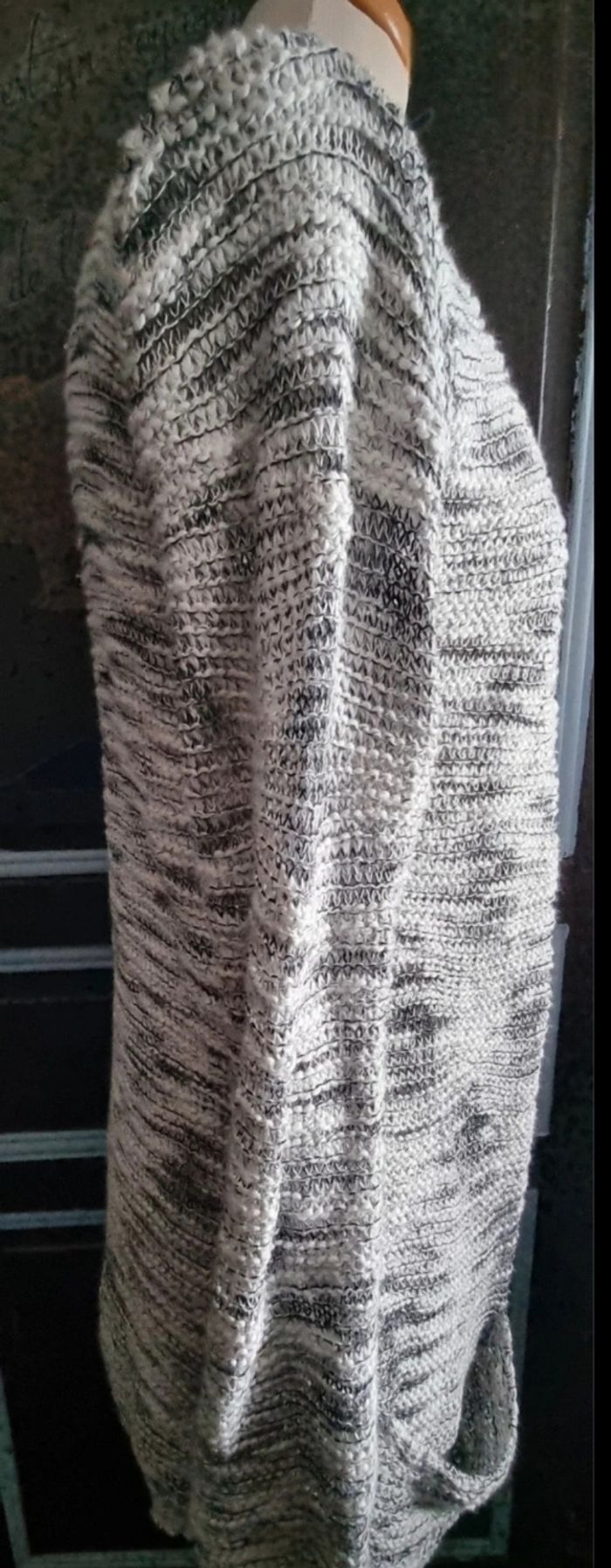 Cardigan taille M ,marque Kiabi, blanc à reflet gris,longueur 87cm, largeur 46cm, longueur épaule à aisselle 22cm, largeur aisselle à aisselle 44cm, longueur manche 55cm.