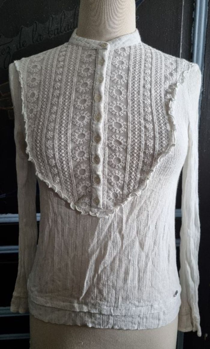 Chemisiers taille 38 marque Creek, pailleté, avec dentelle,légèrement transparent,longueur 58cm, largeur 39cm, longueur épaule à aisselle 19cm, largeur épaule à épaule 35cm, longueur manche 49cm.