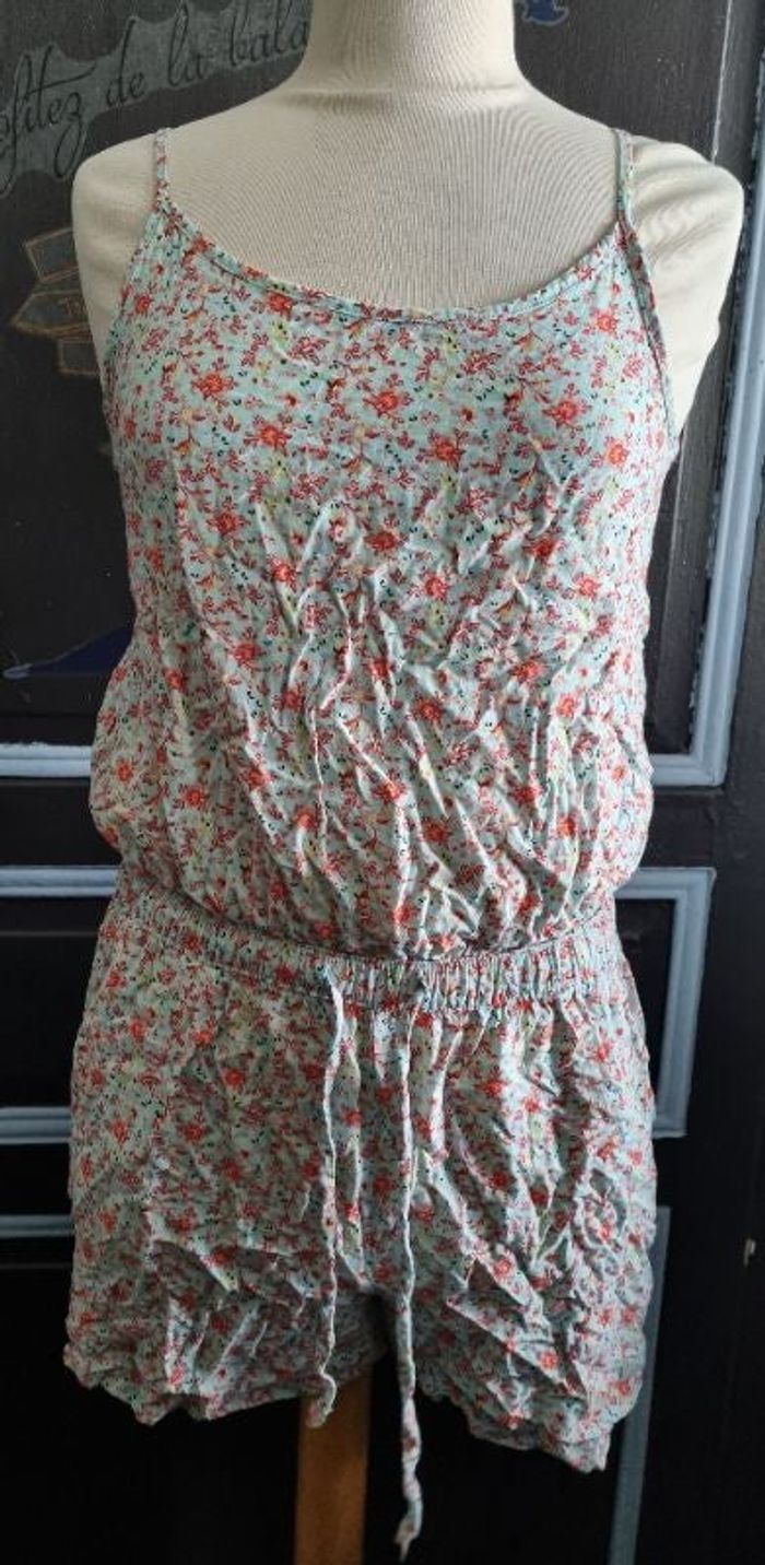 Combi-short à bretelles avec motif fleurs taille 40,marque In Extenso,bretelles réglable,2 poches à l'avant, réglable à la taille,longueur (sans les bretelles) 72cm, largeur aisselle à aisselle 42cm, largeur de la taille 33cm jusqu'à 38cm, largeur cuisse 22cm.