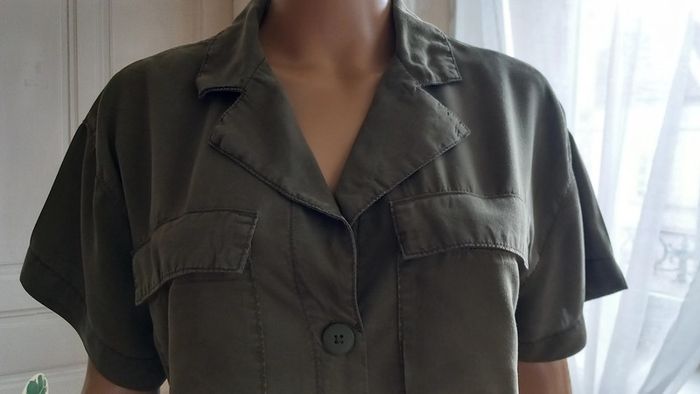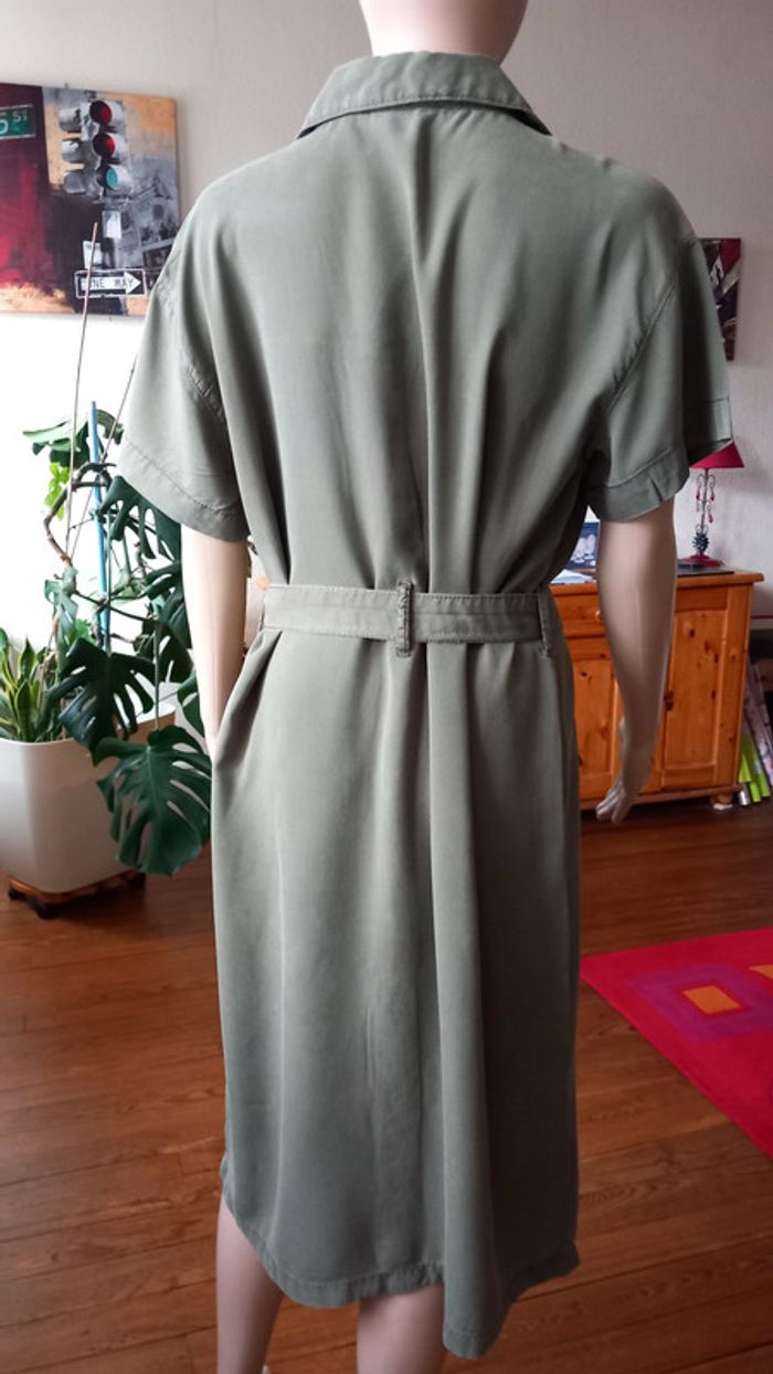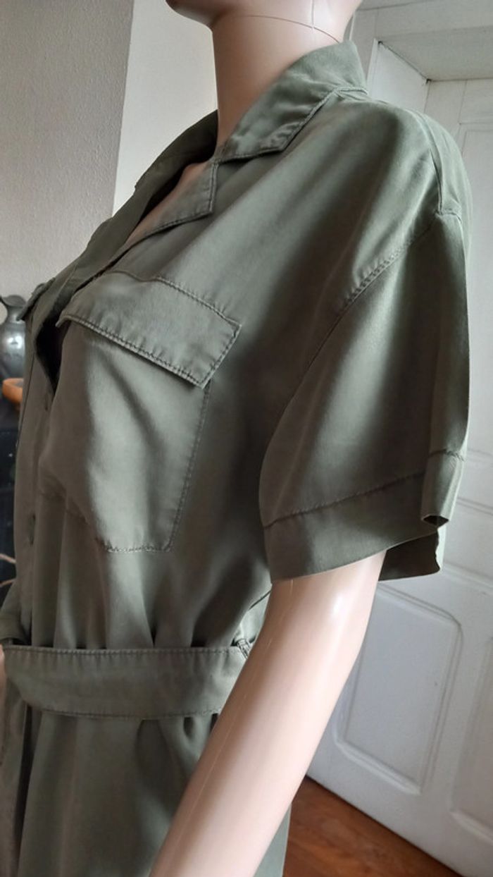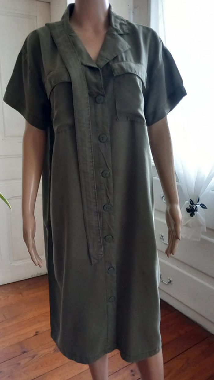 Très jolie robe boutonnée sur toute la longueur Composition : 100% Tencel (fibre écologique artificielle 100% cellulosique, parfois appelé soie végétale ) Marque : Primark Taille : 40 A porter ceinturée ou non Coloris : Kaki État impeccable #carlisle66femmetaille40