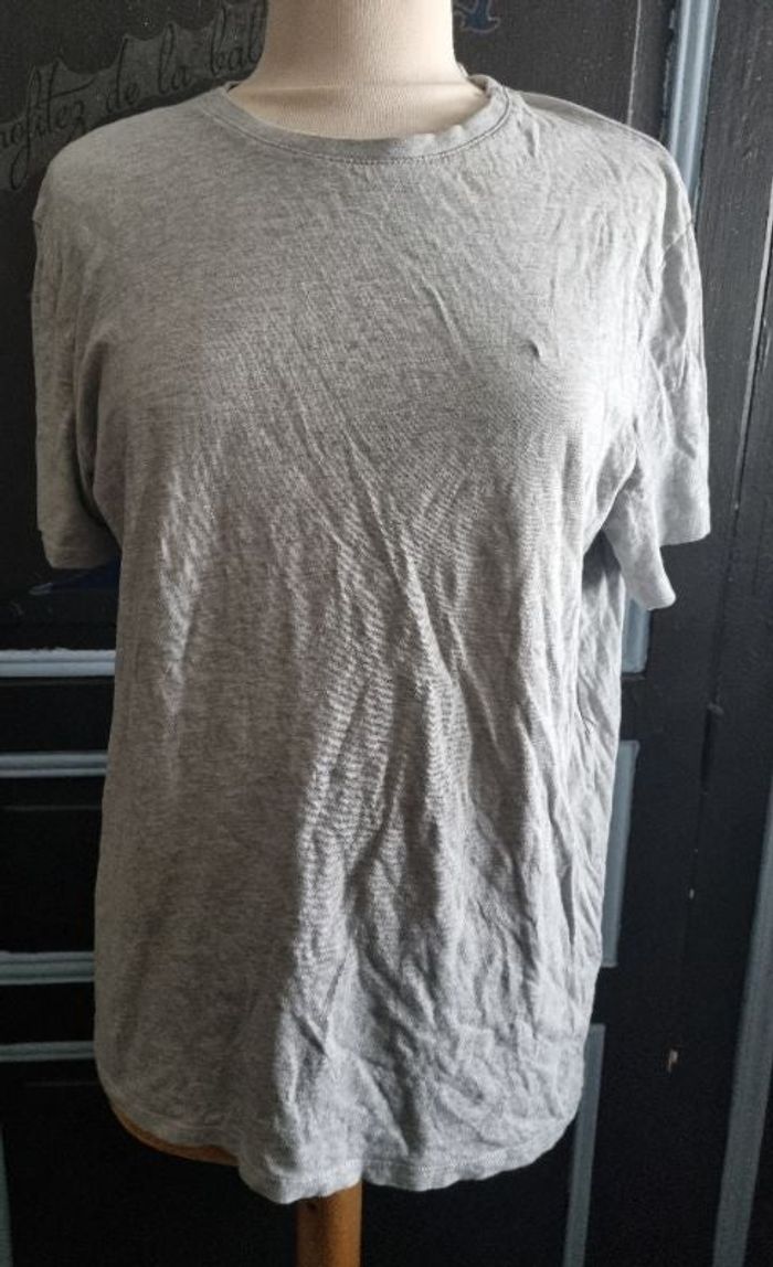 T-shirt mixte gris clair, taille L marque Kiabi,longueur 65cm, largeur 52cm, longueur épaule à aisselle 22cm, largeur aisselle à aisselle 50cm.