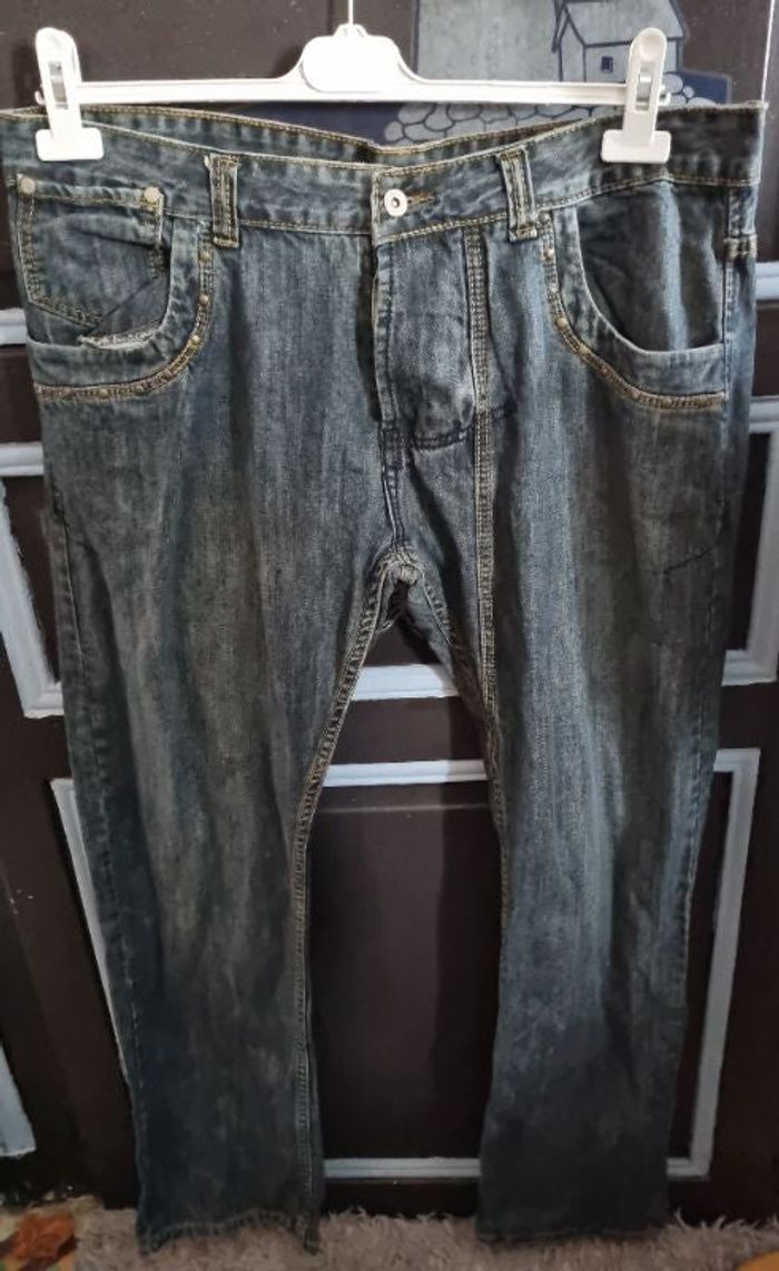 Jeans homme taille 48 avec motifs sur les poches arrière, manque un petit rivet (voir dernière photo),longueur 107cm, largeur de la taille 51cm, largeur cuisse 30cm, largeur cheville 20cm.
